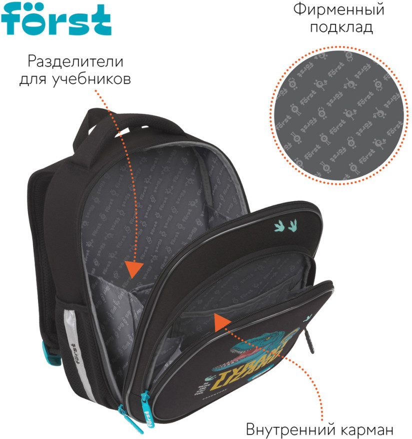 💳 Оплатить за товар можно при получении 🇰🇿 Есть бесплатная доставка по Казахстану 🎁 Копите бонусы с каждой покупки Серия: Cool adventure Ранец Först F-Light с двумя отделениями и двумя внешними карманами, разделителями для учебников и тетрадей, внутренним карманом. Передняя часть и спинка ранца жесткие, а боковые панели уплотнены слоем спонжа. Благодаря анатомической вентилируемой спинке, а также регулируемым по длине лямкам и нагрудному креплению, он плотно фиксируется на спине ребенка. Дно — из водонепроницаемого материала для защиты от влаги. Ранец с плотной ручкой и петлей для подвешивания. Световозвращающие элементы на передней части, сбоку и на лямках обеспечивают безопасность ребенка в темное время суток. |