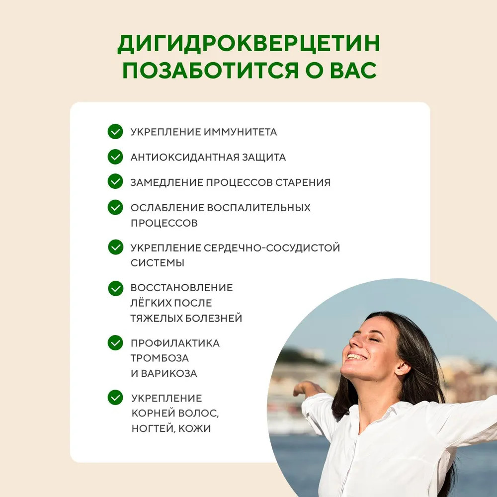 • мощный антиоксидант: дигидрокверцетин обладает явными антиоксидантными свойствами и укрепляет основанную на ферментах систему защиты организма от оксидантов. Таким образом, он поддерживает организм во время биологического стресса (активации иммунитета, воспаления или аллергии);