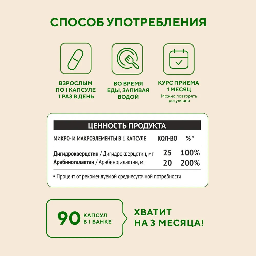 Исследования доказали — дигидрокверцетин обладает антиоксидантной активностью в 49 раз выше, чем стандартный антиоксидант витамин Е! Именно эти свойства дигидрокверцетина улучшают работоспособность, укрепляет общий тонус организма и обладает мягким противовоспалительным действием. Регулярное употребление дигидрокверцетина может способствовать продлению жизни до 25 лет, доказали исследования.