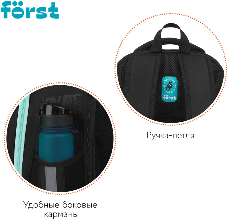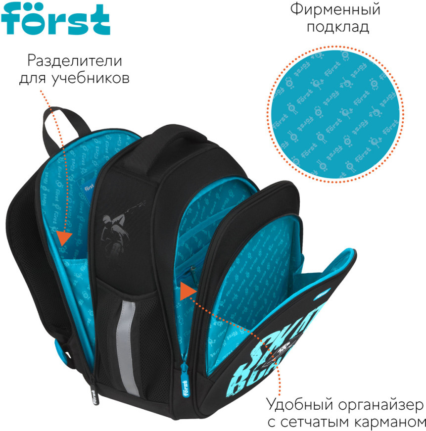 💳 Оплатить за товар можно при получении 🇰🇿 Есть бесплатная доставка по Казахстану от 1 дня 🎁 Копите бонусы с каждой покупки Серия: Skateboard Ранец Först F-Light с двумя отделениями и двумя внешними карманами, разделителями для учебников и тетрадей, внутренним карманом. Передняя часть и спинка ранца жесткие, а боковые панели уплотнены слоем спонжа. Благодаря анатомической вентилируемой спинке, а также регулируемым по длине лямкам и нагрудному креплению, он плотно фиксируется на спине ребенка. Дно — из водонепроницаемого материала для защиты от влаги. Ранец с плотной ручкой и петлей для подвешивания. Световозвращающие элементы на передней части, сбоку и на лямках обеспечивают безопасность ребенка в темное время суток. |
