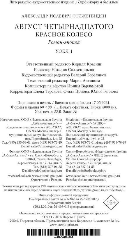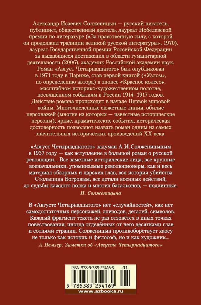💳 Оплатить за товар можно при получении 🇰🇿 Есть бесплатная доставка по Казахстану от 1 дня 🎁 Копите бонусы с каждой покупки Серия: Русская литература. Большие книги Александр Исаевич Солженицын — русский писатель, публицист, общественный деятель, лауреат Нобелевской премии по литературе («За нравственную силу, с которой он продолжил традиции великой русской литературы», 1970), лауреат Государственной премии Российской Федерации за выдающиеся достижения в области гуманитарной деятельности (2006), академик Российской академии наук. Роман «Август Четырнадцатого» был опубликован в 1971 году в Париже, став первой книгой («Узлом», по определению автора) в эпопее «Красное Колесо», масштабном историко-художественном полотне, посвящённом событиям в России 1914–1917 годов. Действие романа происходит в начале Первой мировой войны. Многочисленные сюжетные линии, обилие персонажей (многие из которых — известные исторические персоны), яркие, драматические события, историческая достоверность позволяют назвать роман одним из самых значительных исторических произведений ХХ века. |