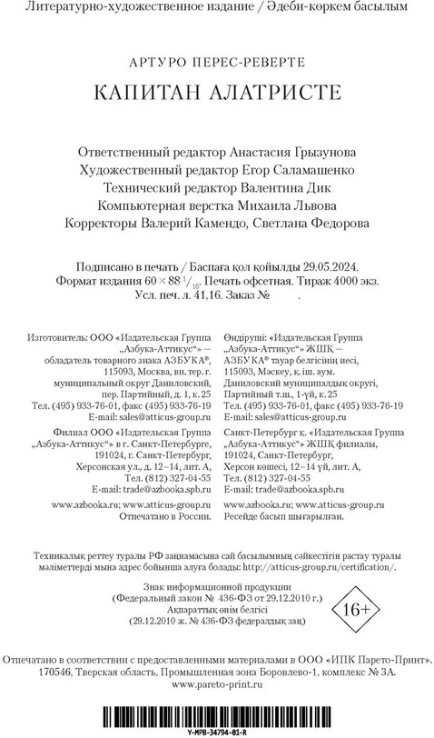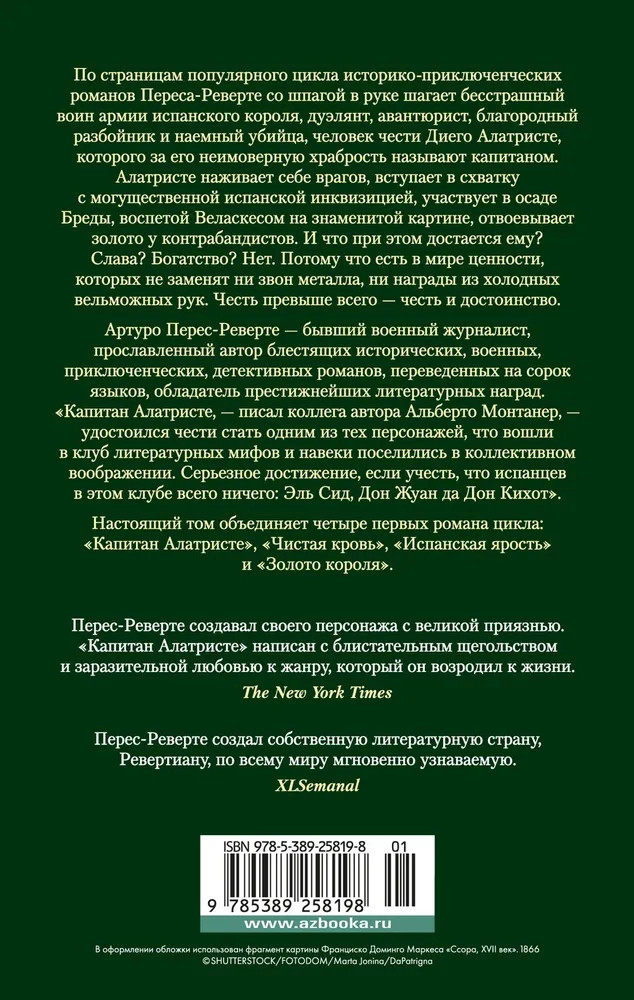 Серия: Мир приключений. Большие книги По страницам популярного цикла историко-приключенческих романов Переса-Реверте со шпагой в руке шагает бесстрашный воин армии испанского короля, а в свободное от сражений время дуэлянт, авантюрист, благородный разбойник и наемный убийца, человек чести Диего Алатристе, которого за его неимоверную храбрость называют капитаном. Он всегда ходит по острию клинка, а судьба то несправедлива к нему, то благосклонна — Алатристе наживает себе врагов, вступает в схватку с могущественной испанской инквизицией, участвует в долгой осаде Бреды, воспетой великим Веласкесом на знаменитой картине, отвоевывает золото у контрабандистов, нелегально вывозящих его из Нового Света. И что при этом достается ему? Слава? Богатство? Нет. Потому что есть в мире ценности, которых не заменит ни звон металла, ни награды из холодных вельможных рук. Честь превыше всего — честь и достоинство. Артуро Перес-Реверте — бывший военный журналист, прославленный автор блестящих исторических, военных, приключенческих, детективных романов, переведенных на сорок языков, обладатель престижнейших литературных наград; цикл об Алатристе — один из высочайших его литературных взлетов. «Капитан Алатристе, — писал о цикле коллега автора Альберто Монтанер, — удостоился чести стать одним из тех персонажей, что вошли в клуб литературных мифов и навеки поселились в коллективном воображении. Серьезное достижение, если учесть, что испанцев в этом клубе всего ничего: Эль Сид, Дон Жуан да Дон Кихот». Настоящий том объединяет четыре первых романа цикла: «Капитан Алатристе», «Чистая кровь», «Испанская ярость» и «Золото короля». |