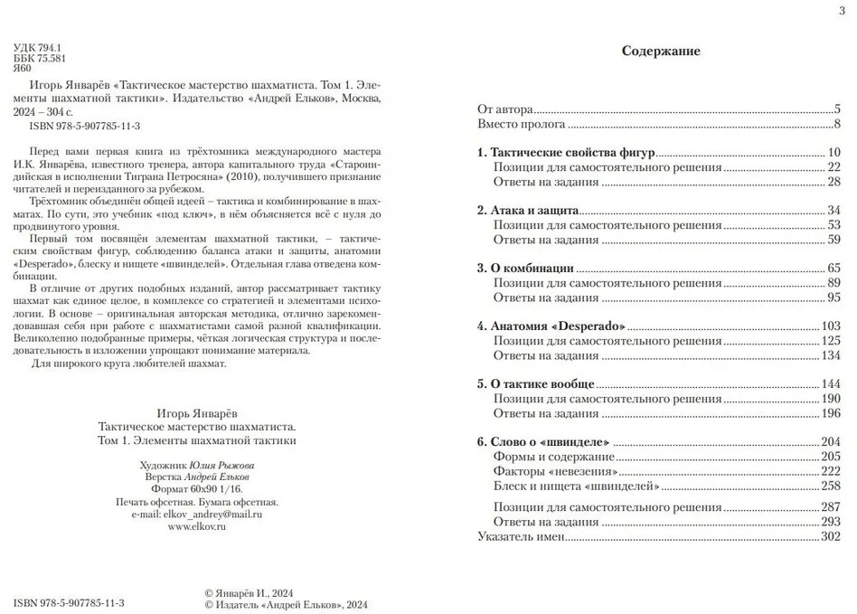 💳 Оплатить за товар можно при получении 🇰🇿 Есть бесплатная доставка по Казахстану от 1 дня 🎁 Копите бонусы с каждой покупки Перед вами первая книга из трёхтомника международного мастера И. К. Январёва, известного тренера, автора капитального труда «Староиндийская в исполнении Тиграна Петросяна» (2010), получившего признание читателей и переизданного за рубежом. Трёхтомник объединён общей идеей — тактика и комбинирование в шахматах. По сути, это учебник «под ключ», в нём объясняется всё с нуля до продвинутого уровня. Первый том посвящён элементам шахматной тактики, — тактическим свойствам фигур, соблюдению баланса атаки и защиты, анатомии «Desperado», блеску и нищете «швинделей». Отдельная глава отведена комбинации. В отличие от других подобных изданий, автор рассматривает тактику шахмат как единое целое, в комплексе со стратегией и элементами психологии. В основе — оригинальная авторская методика, отлично зарекомендовавшая себя при работе с шахматистами самой разной квалификации. Великолепно подобранные примеры, чёткая логическая структура и последовательность в изложении упрощают понимание материала. Для широкого круга любителей шахмат. |