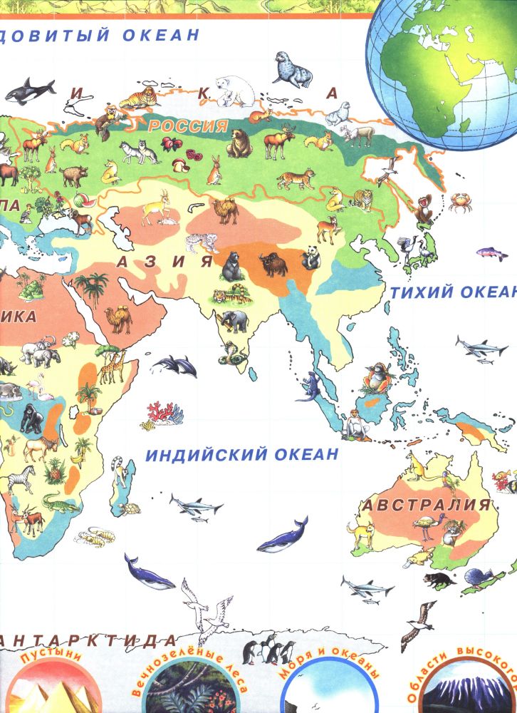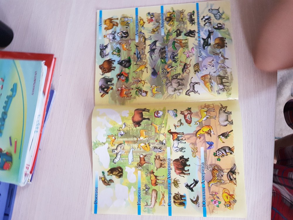 Атлас большой, несколько разворотов. Представлены все континенты. Кроме животных, в кружочках нарисованы памятники, достопримечательности континентов. Взрослым тоже интересно узнать где какие животные живут. Но мало наклеек! Для такого большого атласа , их мало.