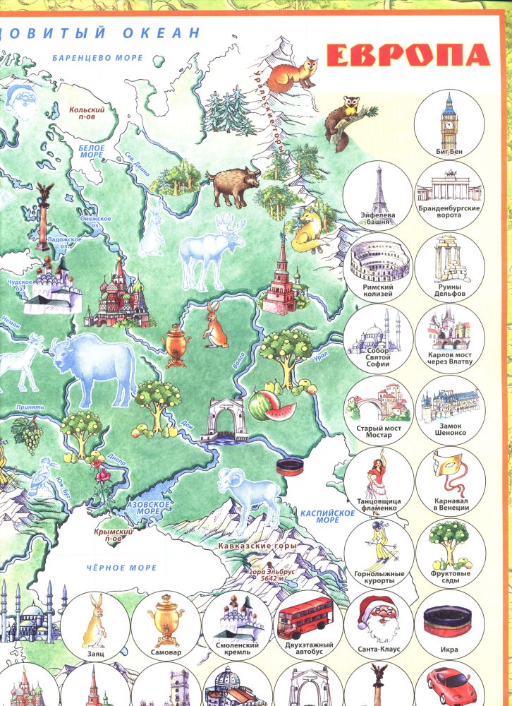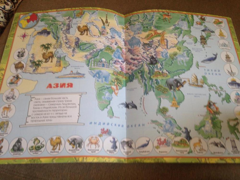 Прекрасный атлас за такую цену! Понравилось, что помимо наклеек на каждой странице внизу в кружочках нарисованы достопримечательности, животные, растения, которые надо находить на карте.