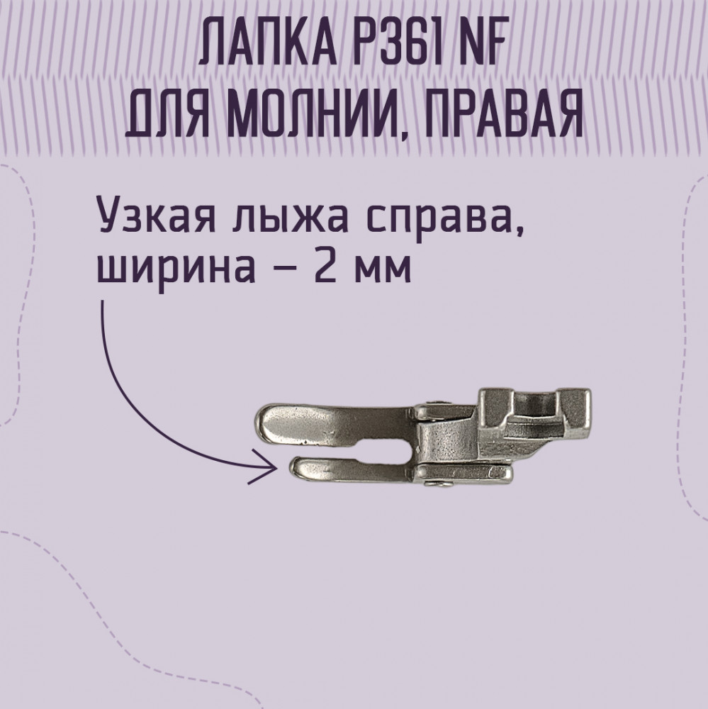 Yoke Лапка для молнии P361 NF правая для промышленных машинВ данный момент этот товар отсутствует в продаже. Возможно, у нас найдется аналогичный или похожий товар здесь. Лапка P361 NF для промышленных стачивающих прямострочных швейных машин с нижним и игольным продвижением (беспосадочные) с узкой лыжей с правой стороны, шириной 2 миллиметра. С ее помощью появляется возможность быстро и качественно пришить тракторную либо спиральную молнию к швейному изделию. Используется как для верхней одежды, так и при производстве спортивных костюмов, платьев, свитшотов и т.д. |