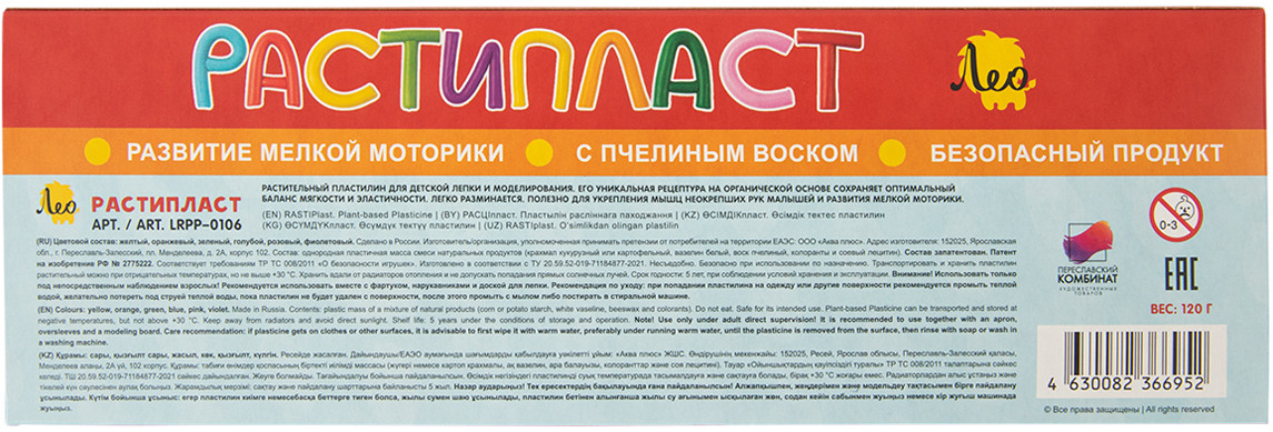 Лео Пластилин «Растипласт»В данный момент этот товар отсутствует в продаже. Возможно, у нас найдется аналогичный или похожий товар здесь. Серия: Расти Пластилин на растительной основе предназначен для детской лепки и моделирования. Его уникальная рецептура на органической основе сохраняет оптимальный баланс мягкости и эластичности. Благодаря запатентованному составу, состоящего только из натуральных продуктов, нетоксичен и безопасен для самых маленьких, не содержит глютена и продуктов нефтепереработки. Легко разминается, обладает повышенной пластичностью, не деформируется, не высыхает и не крошится. Яркие и насыщенные цвета прекрасно смешиваются между собой. Растипласт идеален для укрепления мышц неокрепших рук малышей и развития мелкой моторики. Он намного мягче классического пластилина, поэтому маленький скульптор с удовольствием будет работать неокрепшими пальчиками. |