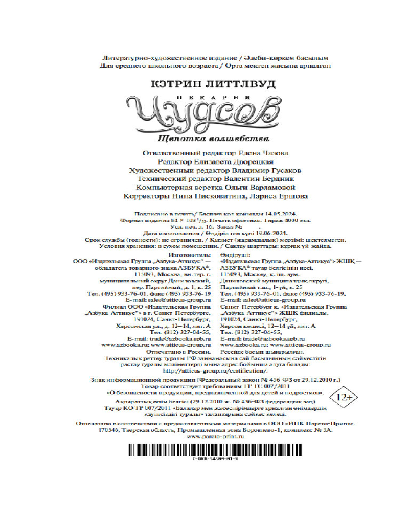 💳 Оплатить за товар можно при получении 🇰🇿 Есть бесплатная доставка по Казахстану от 1 дня 🎁 Копите бонусы с каждой покупки Серия: Детский кинобестселлер Поваренная книга Чудсов украдена! Роз терзает чувство вины, ведь из-за нее главное семейное сокровище попало в чужие руки, поэтому девочка готова на все, лишь бы вернуть Книгу. Юная волшебница бросает тете Лили вызов: если победит на международном кулинарном конкурсе «Гала де Гато Гран» в Париже, то заберет Книгу, а если потерпит поражение, то... и представить страшно, что будет! Только вот коварная Лили и не думает играть по-честному. И чтобы обойти тетушку, Роз отправляется на поиски волшебных ингредиентов для конкурсных блюд, а на помощь девочке приходят ее братья, младшая сестренка и ворчливый дедушка со своим говорящим котом. Кэтрин Литтлвуд — писательница и актриса из Нью-Йорка. «Пекарня Чудсов. Щепотка волшебства» — продолжение ее дебютного романа, полюбившегося юным читателям не только на родине автора, но и в разных странах по всему миру. |