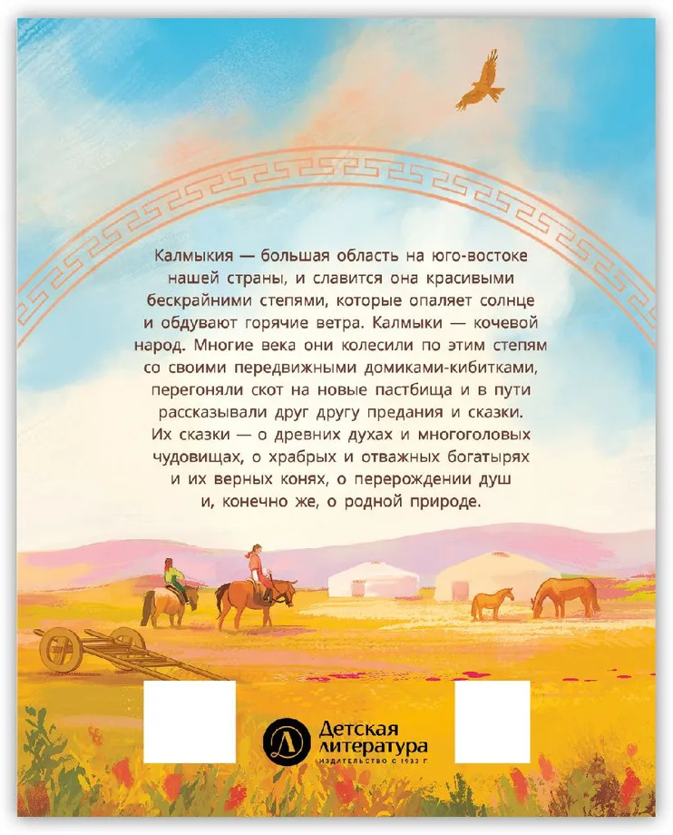 💳 Оплатить за товар можно при получении 🇰🇿 Есть бесплатная доставка по Казахстану от 1 дня 🎁 Копите бонусы с каждой покупки Калмыкия — большая область на юго-востоке нашей страны, и славится она красивыми бескрайними степями, которые опаляет солнце и обдувают горячие ветра. Калмыки — кочевой народ. Многие века они колесили по этим степям со своими передвижными домиками-кибитками, перегоняли скот на новые пастбища и в пути рассказывали друг другу предания и сказки. Их сказки — о древних духах и многоголовых чудовищах, о храбрых и отважных богатырях и их верных конях, о перерождении душ и, конечно же, о родной природе. |