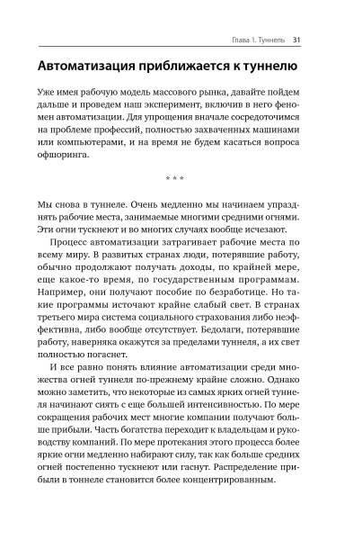 Автор предлагает нам провести мысленный эксперимент для изучения экономики будущего. Он использует воображаемый «туннель огней» для визуализации экономических последствий новых технологий, которые появятся в ближайшие годы и десятилетия. Книга бросает вызов привычным представлениям о будущем и обозначает опасности, которые ждут нас впереди.
