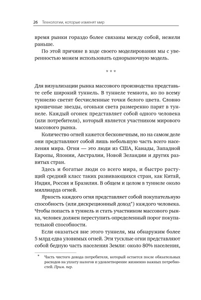 — Автор предлагает провести мысленный эксперимент для изучения экономики будущего. Он использует воображаемый «туннель огней» для визуализации экономических последствий новых технологий, которые появятся в ближайшие годы и десятилетия.