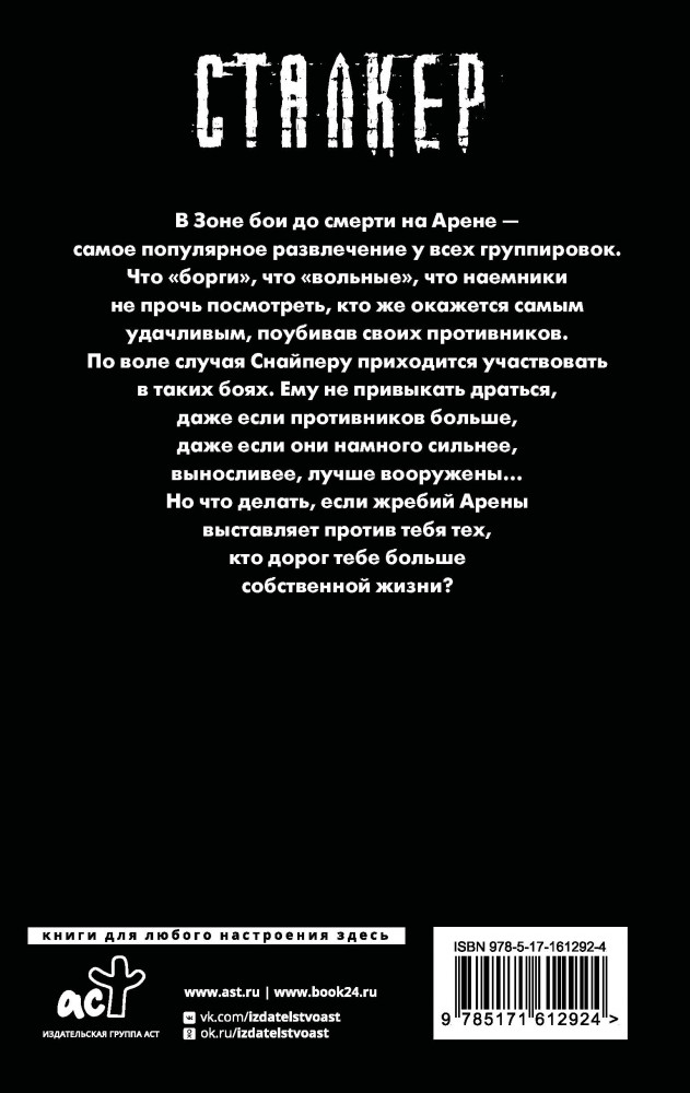 💳 Оплатить за товар можно при получении 🇰🇿 Есть бесплатная доставка по Казахстану от 1 дня 🎁 Копите бонусы с каждой покупки Серия: Сталкер В Зоне бои до смерти на Арене — самое популярное развлечение у всех группировок. Что «борги», что «вольные», что наемники не прочь посмотреть, кто же окажется самым удачливым, поубивав своих противников. По воле случая Снайперу приходится участвовать в таких боях. Ему не привыкать драться, даже если противников больше, даже если они намного сильнее, выносливее, лучше вооружены... Но что делать, если жребий Арены выставляет против тебя тех, кто дорог тебе больше собственной жизни? |