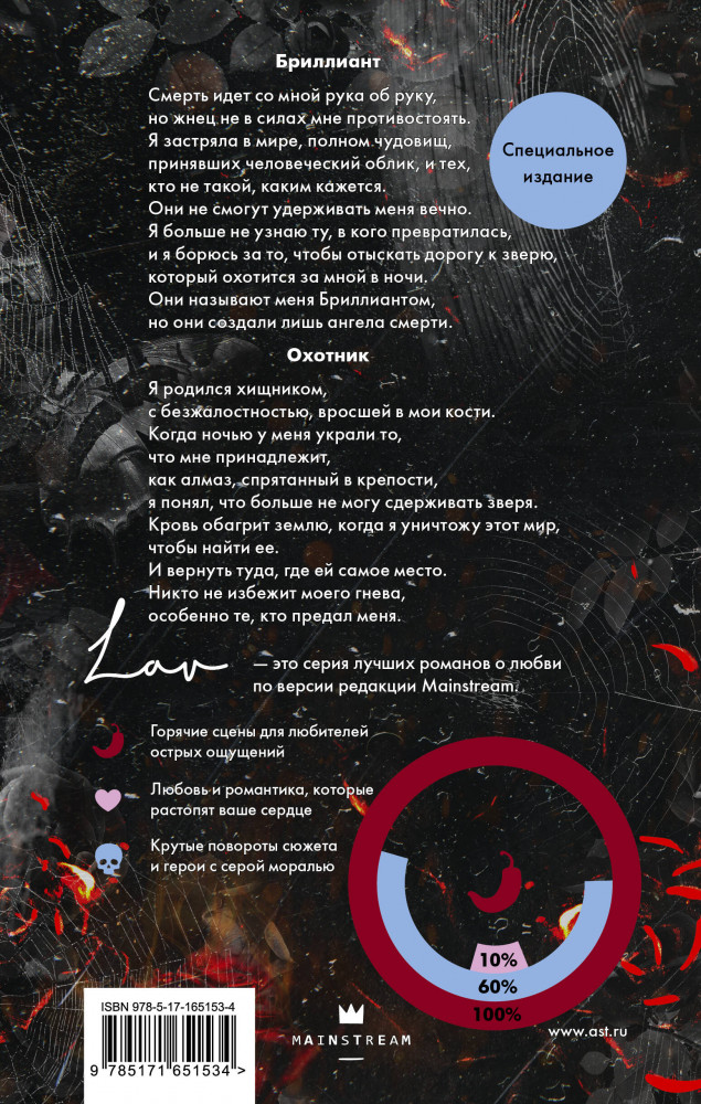 💳 Оплатить за товар можно при получении 🇰🇿 Есть бесплатная доставка по Казахстану от 1 дня 🎁 Копите бонусы с каждой покупки Серия: LAV. Темный роман Смерть идет со мной рука об руку, но жнец не в силах мне противостоять. Я застряла в мире, полном чудовищ, принявших человеческий облик, и тех, кто не такой, каким кажется. Они не смогут удерживать меня вечно. Я больше не узнаю ту, в кого превратилась, и я борюсь за то, чтобы отыскать дорогу к зверю, который охотится за мной в ночи. Они называют меня бриллиантом, но они создали лишь ангела смерти. Охотник Я родился хищником, с безжалостностью, вросшей в мои кости. Когда ночью у меня украли то, что мне принадлежит, как алмаз, спрятанный в крепости. Я понял, что больше не могу сдерживать зверя. Кровь обагрит землю, когда я уничтожу этот мир, чтобы найти ее. И вернуть ее туда, где ей самое место. Никто не избежит моего гнева, особенно те, кто предал меня. |