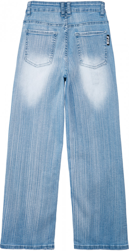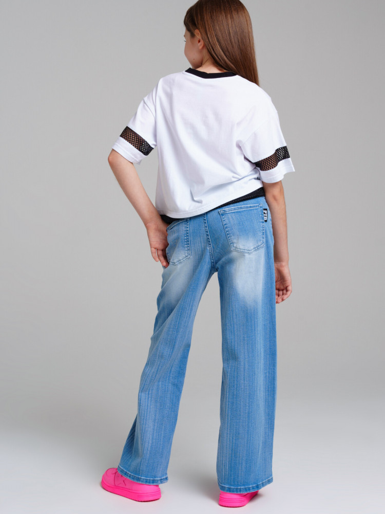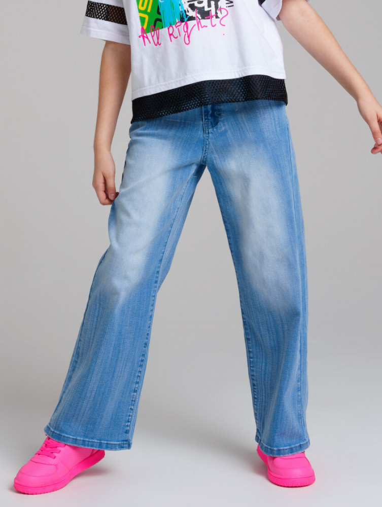 Джинсы для девочки. Застежка на пуговицу, пояс с внутренней утяжкой. Крой Wide leg ― это свободная посадка и расклёшенные от бедра штанины. Высокая посадка.