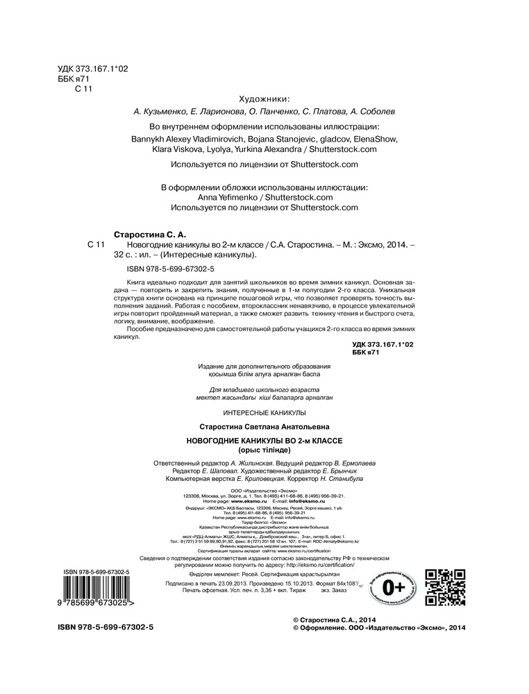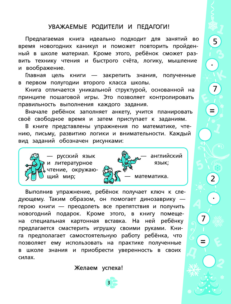В данный момент этот товар отсутствует в продаже. Возможно, у нас найдется аналогичный или похожий товар здесь. Серия: Интересные каникулы Книга идеально подходит для занятий школьников во время зимних каникул. Основная задача — повторить и закрепить знания, полученные в 1-м полугодии 2-го класса. Уникальная структура книги основана на принципе пошаговой игры, что позволяет проверять точность выполнения заданий. Работая с пособием, второклассник ненавязчиво в процессе увлекательной игры повторит пройденный материал, а также сможет развить технику чтения, технику быстрого счета, языковые и познавательные способности, логику, внимание, воображение.