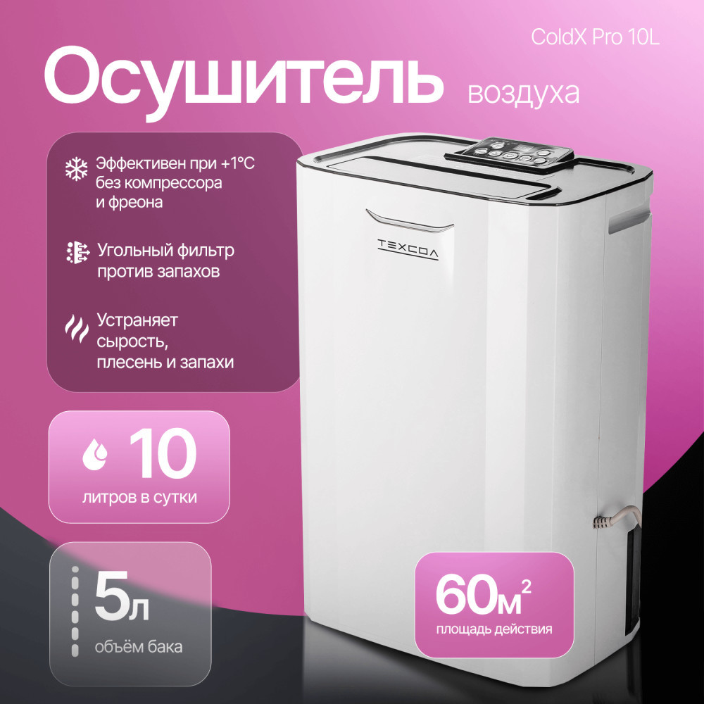 Осушитель воздуха Техсол ColdX Pro 10L адсорбционный, работает от +1 °C, до 10 л/сутки, бак на 5 л, дренаж, площадь до 60 м². Флагман для холодных и влажных помещений. ColdX Pro 10L эффективно убирает сырость и запах затхлости, предотвращает плесень и запотевание окон. Работает от +1 °C (адсорбционная технология, без компрессора и хладагента), имеет бак 5 л и возможность непрерывного слива. Тихий до 50 дБ, 3 скорости, ночной режим, таймер 24 ч.