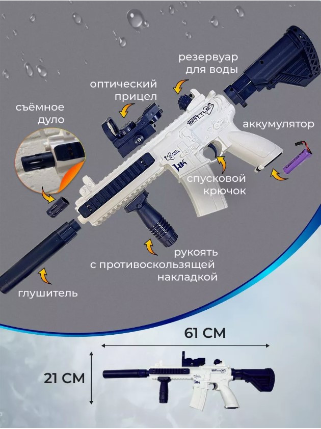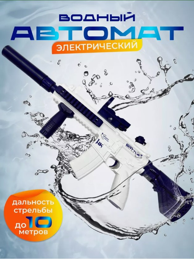 В данный момент этот товар отсутствует в продаже. Возможно, у нас найдется аналогичный или похожий товар здесь. Вот это пушка! Детский игрушечный автомат — бластер Water Gun M416, который работает на аккумуляторе и заполняется водой. Он автоматически выстреливает воду на расстояние до 10 метров, благодаря мощному встроенному электрическому аккумулятору. Резервуар для воды легко наполняется и позволяет детям играть без остановки в течение длительного времени, крышка абсолютно герметична и имеет резиновый уплотнитель, чтобы ничего не мешало играть вашему малышу с этим водным пистолетом. Этот водяной автомат-бластер — отличный подарок для детей, которые любят игры с водой и хотят отлично провести время на свежем воздухе.