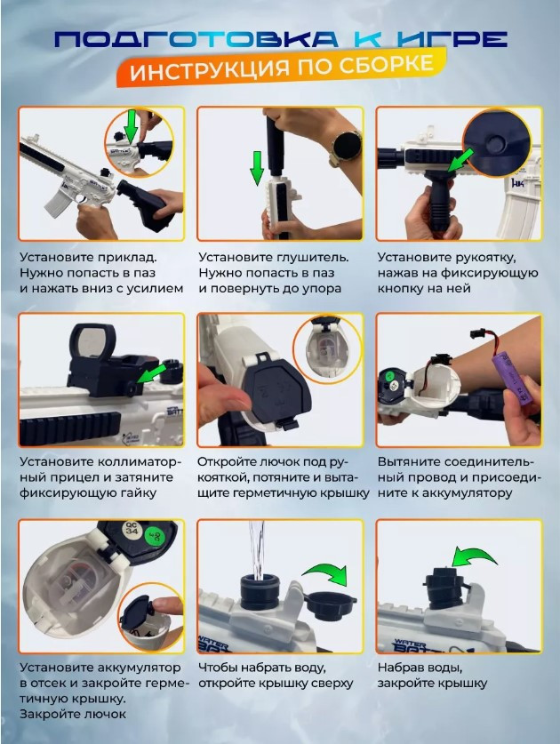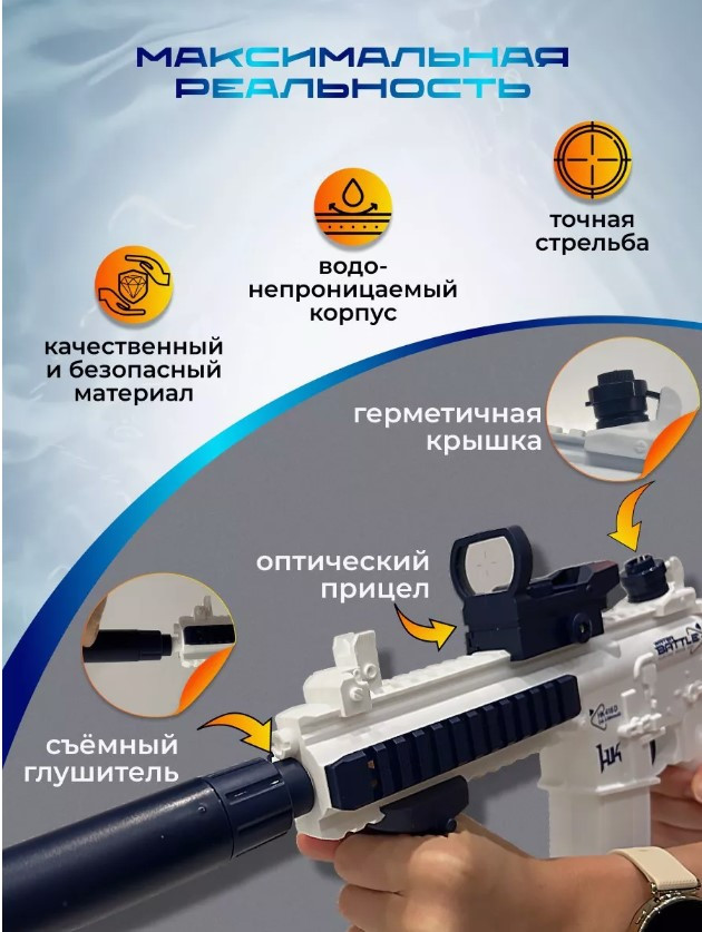 В целом, этот водяной пистолет-бластер легко подключается к аккумулятору, имеет большую дальность стрельбы и обеспечивает яркую и веселую игру пистолет-бластер выполнен из ударопрочного материала, что делает его безопасным и простым в использовании. В комплекте есть даже возможность брать воду порциями, чтобы не переполнять емкость и не перегружать механизм. Он также подходит для использования в бассейне, на пляже или на даче благодаря водонепроницаемому корпусу. водяной пистолет-бластер — отличный способ охладиться и устроить веселую игру с друзьями. Этот Автомат-бластер в виде М416 выглядит очень крутым и выполнен из высококачественных материалов. Ваш ребенок будет рад получить этот пистолет-бластер в подарок. |