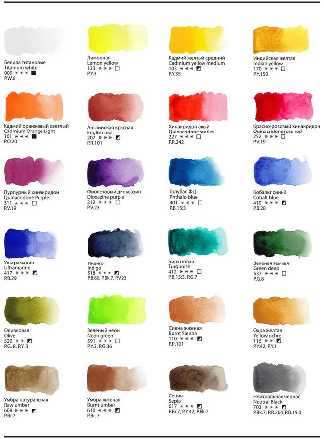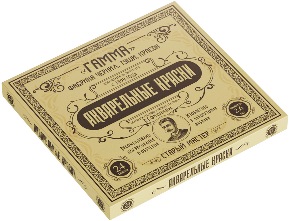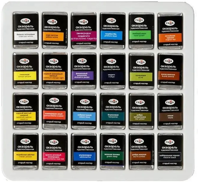 Акварель «Старый мастер» изготавливается без использования дополнительных наполнителей, а многослойная заливка увеличивает долю пигмента. Краски обладают высоким уровнем светостойкости. С помощью акварельных красок серии «Старый мастер» можно писать в различных техниках, например, — лессировка, по — мокрому, заливка, сухая кисть. Каждая кювета упакована в фольгу. На упаковке отображена информация о пигменте.