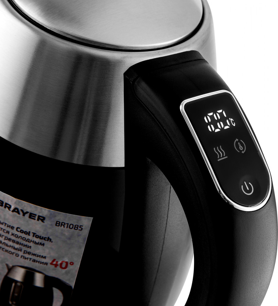 Сенсорное управление чайником расположено на эргономичной ручке, что обеспечивает удобство в его эксплуатации. Вы можете выбрать одну из доступных температур нагрева воды: 40, 50, 60, 70, 80, 90 или 100 градусов (°C), что позволит вам приготовить напиток с учетом ваших предпочтений. Или подогрев для детского питания.
