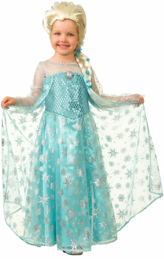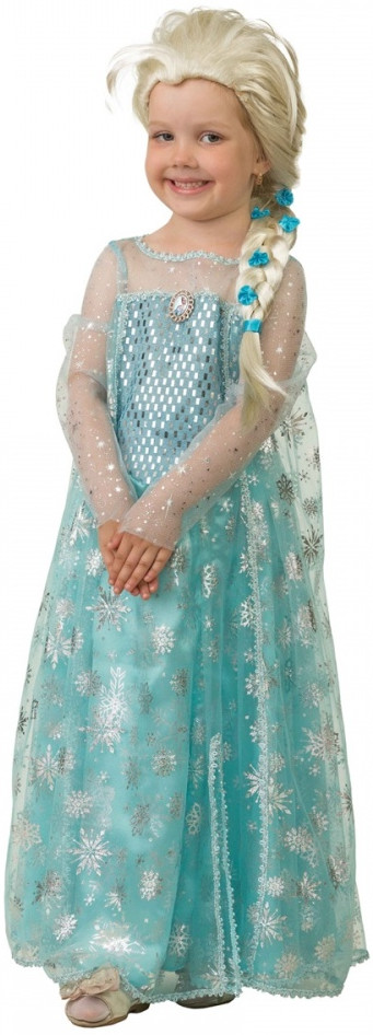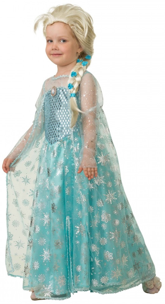 Комплект наряда удивляет. К длинному голубому платью в пол с блестящими серебряными звёздами идёт красивый парик. Он выполнен точь-в-точь, как и причёска главной героини мультика. Поэтому родители могут не переживать по поводу укладки волос юной модницы, с помощью парика можно забыть про сложные детские причёски.