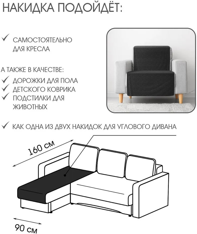 Дивандек для дивана — отличное дополнение для интерьера. Приятный на ощупь полиэстер прекрасно держит форму, не садится после стирки, а обратная сторона с прорезиненным противоскользящим покрытием способствует лучшему прилеганию к поверхности мебели из любого материала и не позволяет изделию съезжать и заминаться.