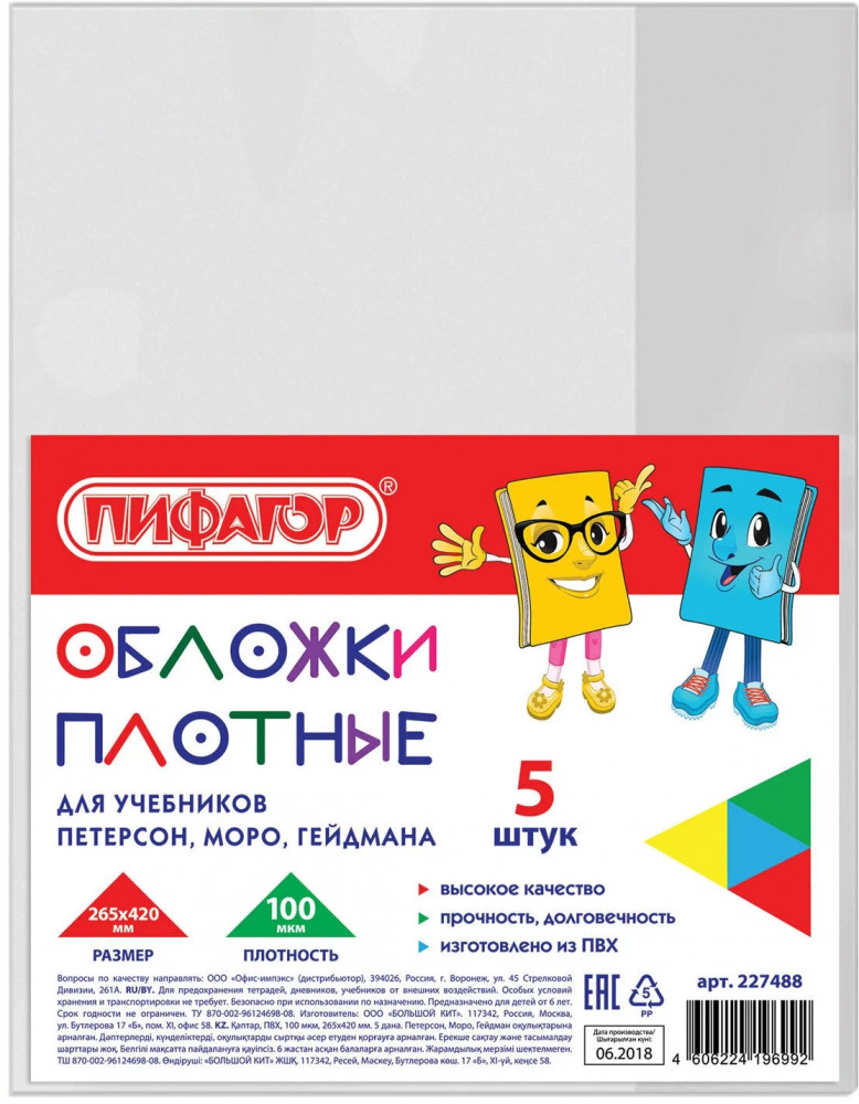💳 Оплатить за товар можно при получении 🇰🇿 Есть бесплатная доставка по Казахстану от 1 дня 🎁 Копите бонусы с каждой покупки Традиционная обложка Пифагор — прозрачная, прочная и долговечная — защитит учебники от механических повреждений, грязи и пыли и надолго сохранит их внешний вид. Прозрачная плотная обложка Пифагор для учебников Петерсон, Моро, Гейдман изготовлена из поливинилхлорида (ПВХ) толщиной 100 мкм. Размер 265 × 420 мм. Традиционная, с двумя клапанами, без возможности регулировки по ширине. В комплекте — 5 штук. |