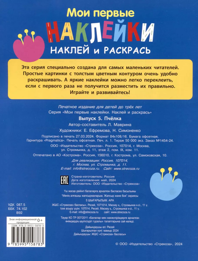 💳 Оплатить за товар можно при получении 🇰🇿 Есть бесплатная доставка по Казахстану от 1 дня 🎁 Копите бонусы с каждой покупки Серия: Мои первые наклейки. Наклей и раскрась Эта серия специально создана для самых маленьких читателей. Простые картинки с толстым цветным контуром очень удобно раскрашивать. А яркие наклейки можно легко переклеить, если с первого раза не получится разместить их правильно. |