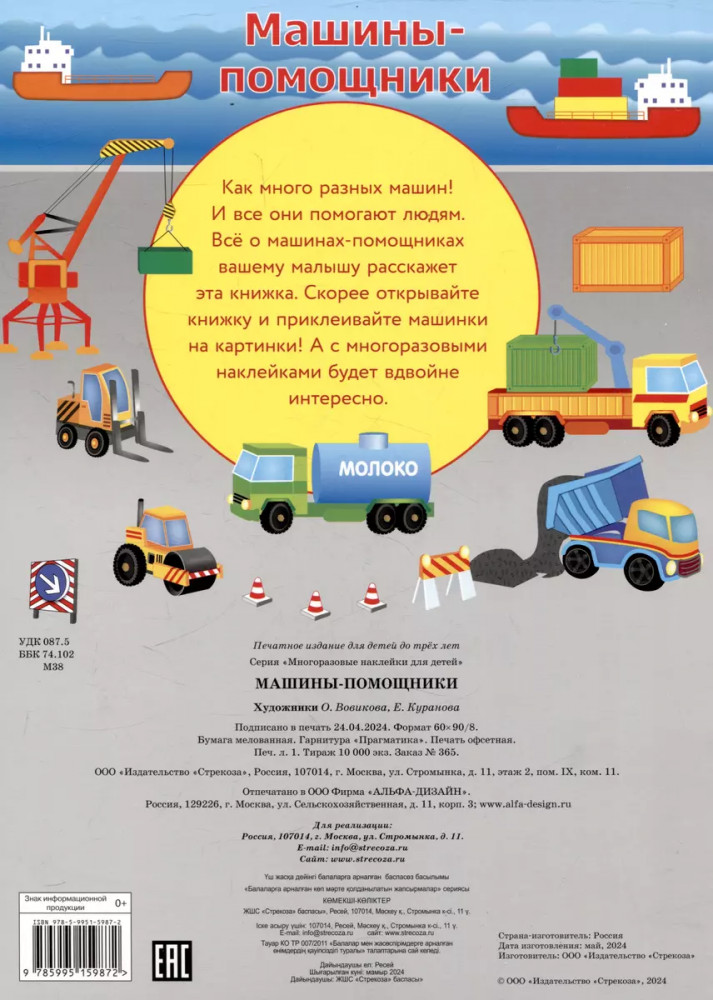 Серия: Многоразовые наклейки Как много разных машин! И все они помогают людям. Всё о машинах-помощниках вашему малышу расскажет эта книжка. А с многоразовыми наклейками будет вдвойне интересно. Скорее открывайте книжку и приклеивайте машинки на странички. |