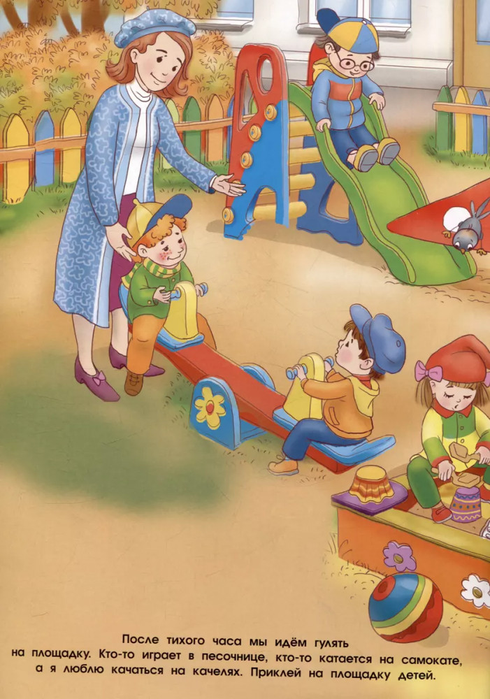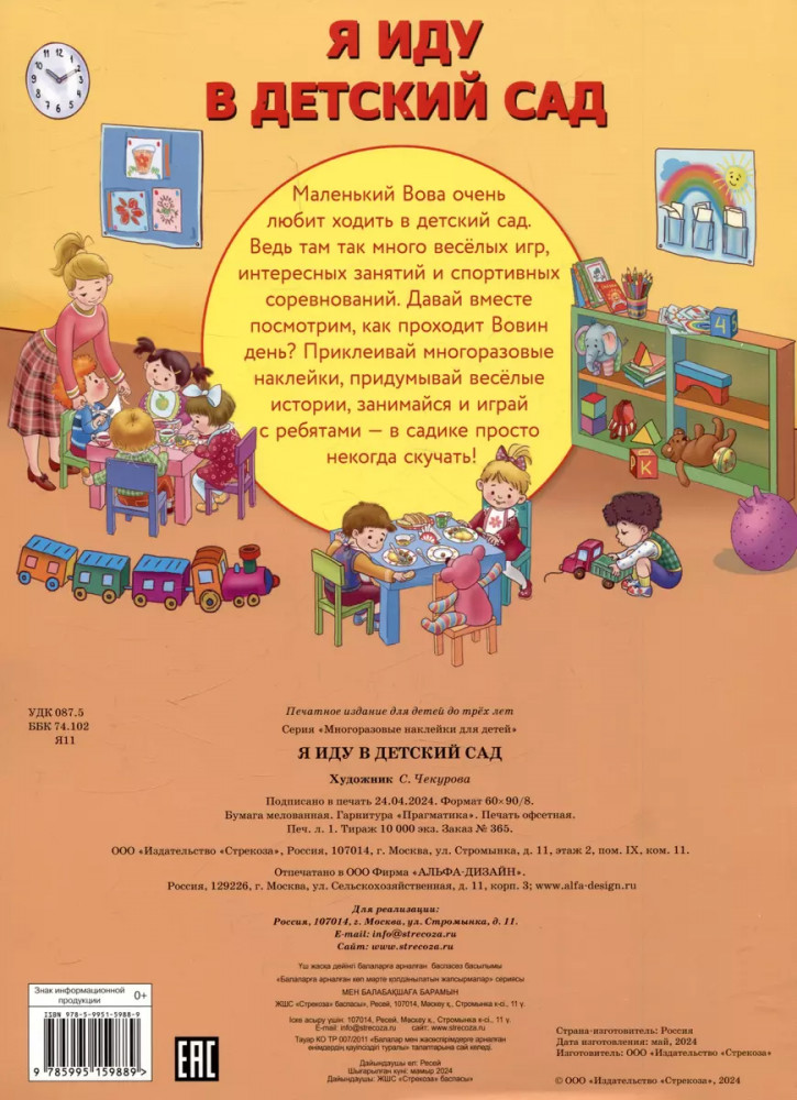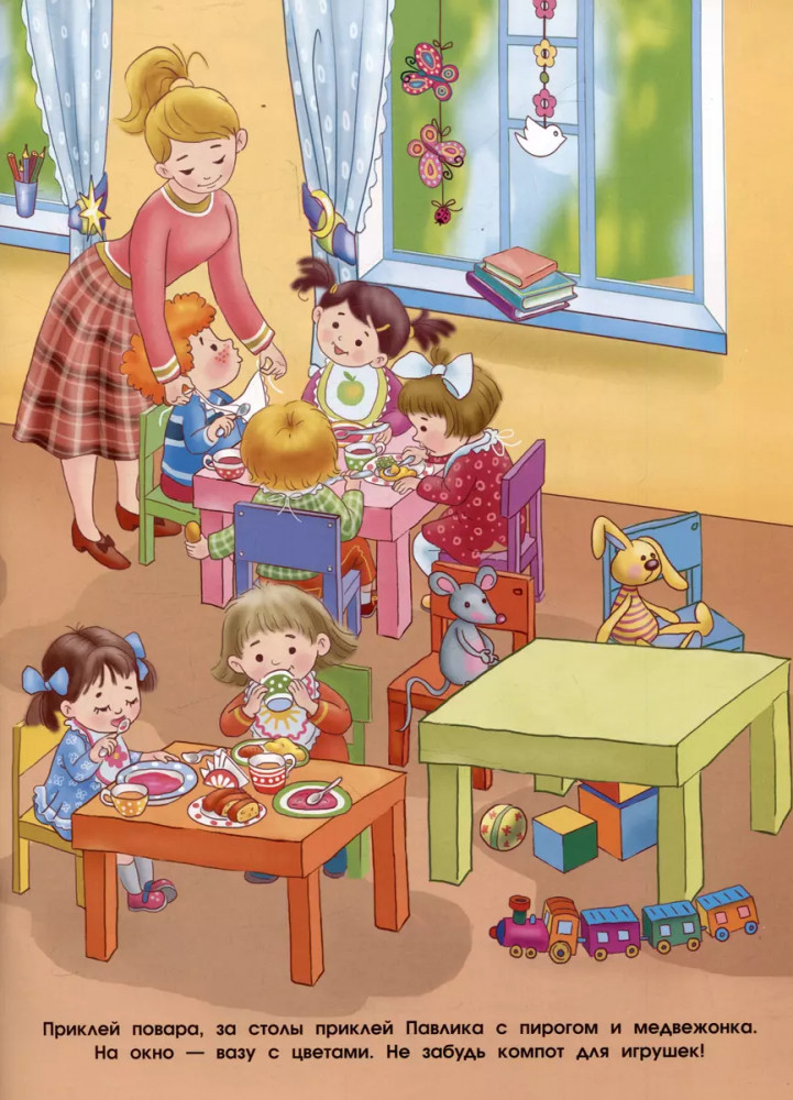 💳 Оплатить за товар можно при получении 🇰🇿 Есть бесплатная доставка по Казахстану от 1 дня 🎁 Копите бонусы с каждой покупки Серия: Многоразовые наклейки Маленький Вова очень любит ходить в детский сад. Ведь там так много весёлых игр, интересных занятий и спортивных соревнований. Давай вместе посмотрим, как проходит Вовин день? Приклеивай многоразовые наклейки, придумывай весёлые истории, занимайся и играй с ребятами — в садике просто некогда скучать! |