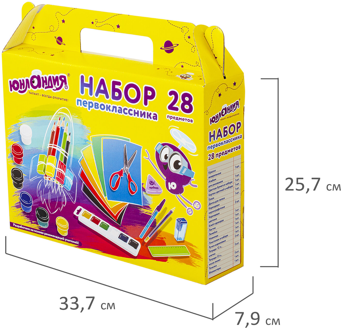 💳 Оплатить за товар можно при получении 🇰🇿 Есть бесплатная доставка по Казахстану от 1 дня 🎁 Копите бонусы с каждой покупки Набор представляет собой подарочную коробку-чемоданчик из плотного картона с красочным дизайном и наполнением. Короб дополнительно упакован в термоусадку. Состав набора разработан на основе рекомендаций учителей и пожеланий родителей таким образом, чтобы обеспечить юного ученика всем необходимым. В состав набора входят только высококачественные сертифицированные отечественные и импортные школьные принадлежности, соответствующие требованиям безопасности детских товаров. Набор канцелярских принадлежностей станет отличный подарком выпускнику детского сада, а родителям поможет сэкономить время и средства при подготовке ребенка к школе. Все самые необходимые школьные принадлежности упакованы в удобный чемоданчик с ручкой. |