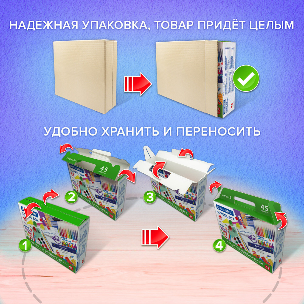 💳 Оплатить за товар можно при получении 🇰🇿 Есть бесплатная доставка по Казахстану 🎁 Копите бонусы с каждой покупки Набор представляет собой подарочную коробку-чемоданчик из плотного картона с красочным дизайном и наполнением. Короб дополнительно упакован в термоусадку. Состав набора разработан на основе рекомендаций учителей и пожеланий родителей таким образом, чтобы обеспечить юного ученика всем необходимым. В состав набора входят только высококачественные сертифицированные отечественные и импортные школьные принадлежности, соответствующие требованиям безопасности детских товаров. |