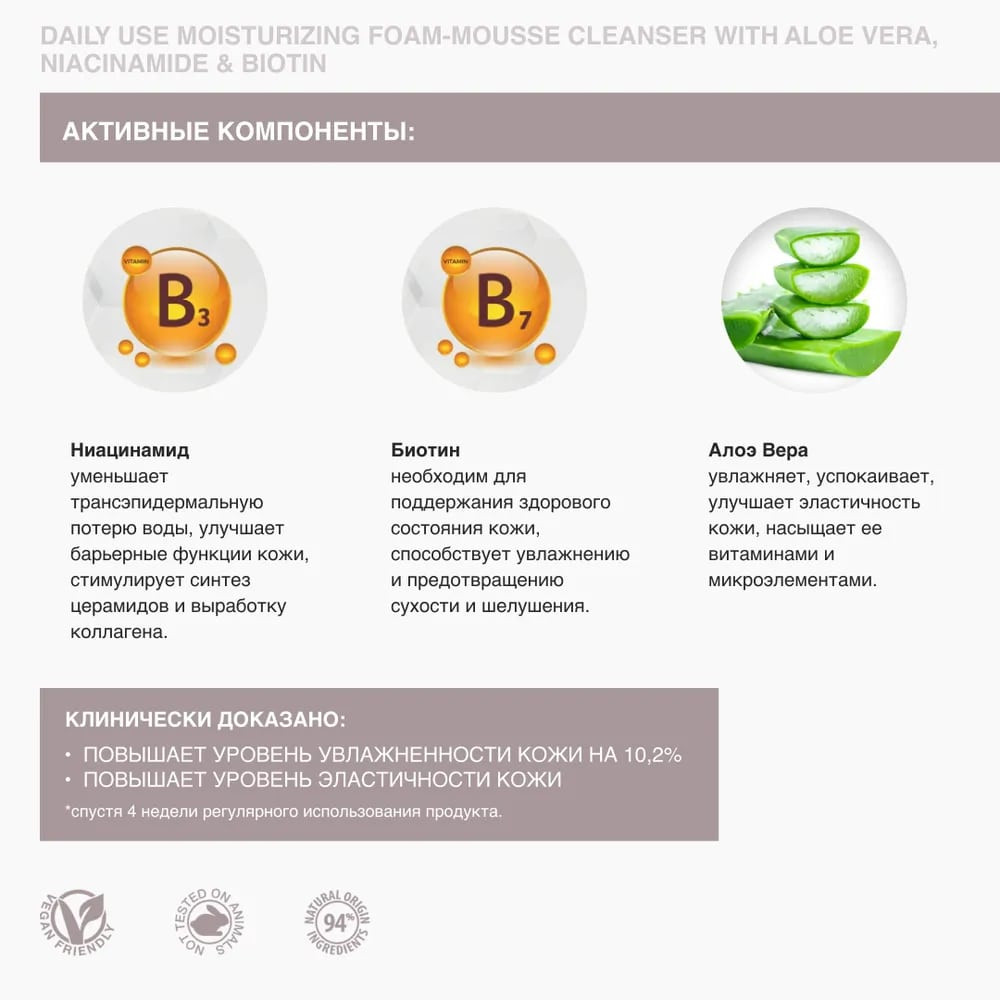 💳 Оплатить за товар можно при получении 🇰🇿 Есть бесплатная доставка по Казахстану от 1 дня 🎁 Копите бонусы с каждой покупки Пенка для умывания Skin Clean Care — это муссовое увлажняющее средство, разработанное для бережного очищения кожи лица. Обогащенная алоэ вера, ниацинамидом и биотином, эта пенка обеспечивает комплексный уход за кожей, поддерживая ее здоровье и естественное сияние. |