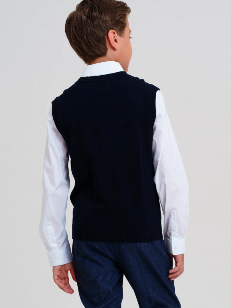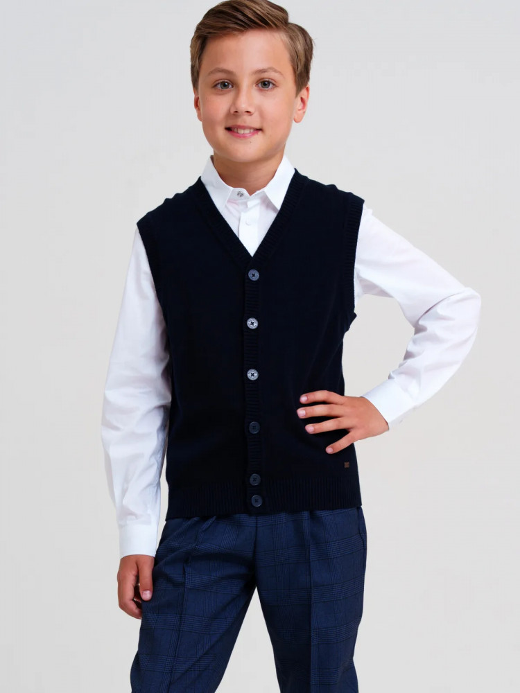 Классический синий школьный жилет на пуговицах для мальчика-подростка. Жилет прямого силуэта выполнен из вязаного трикотажа с высоким содержанием хлопка, что обеспечивает максимальный комфорт для школьника во время занятий. Жилетка в школу выглядит стильно благодаря лаконичному дизайну. Рубашка, футболка или поло плюс жилет для школьника составит красивый элегантный комплект для школы.