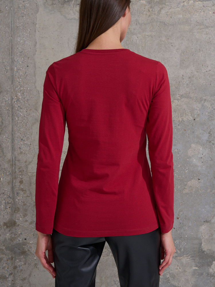 Футболка прямого покроя с втачным длинным рукавом. По линии горловины втачен ворот из эластичного полотна с 5% добавлением лайкры. Перед и спинка цельнокроеные. Плечевые швы обтачены бейкой из основного полотна, в край проложена отделочная строчка. Низ футболки и рукава подогнуты и подшиты на распошивальной машине.
