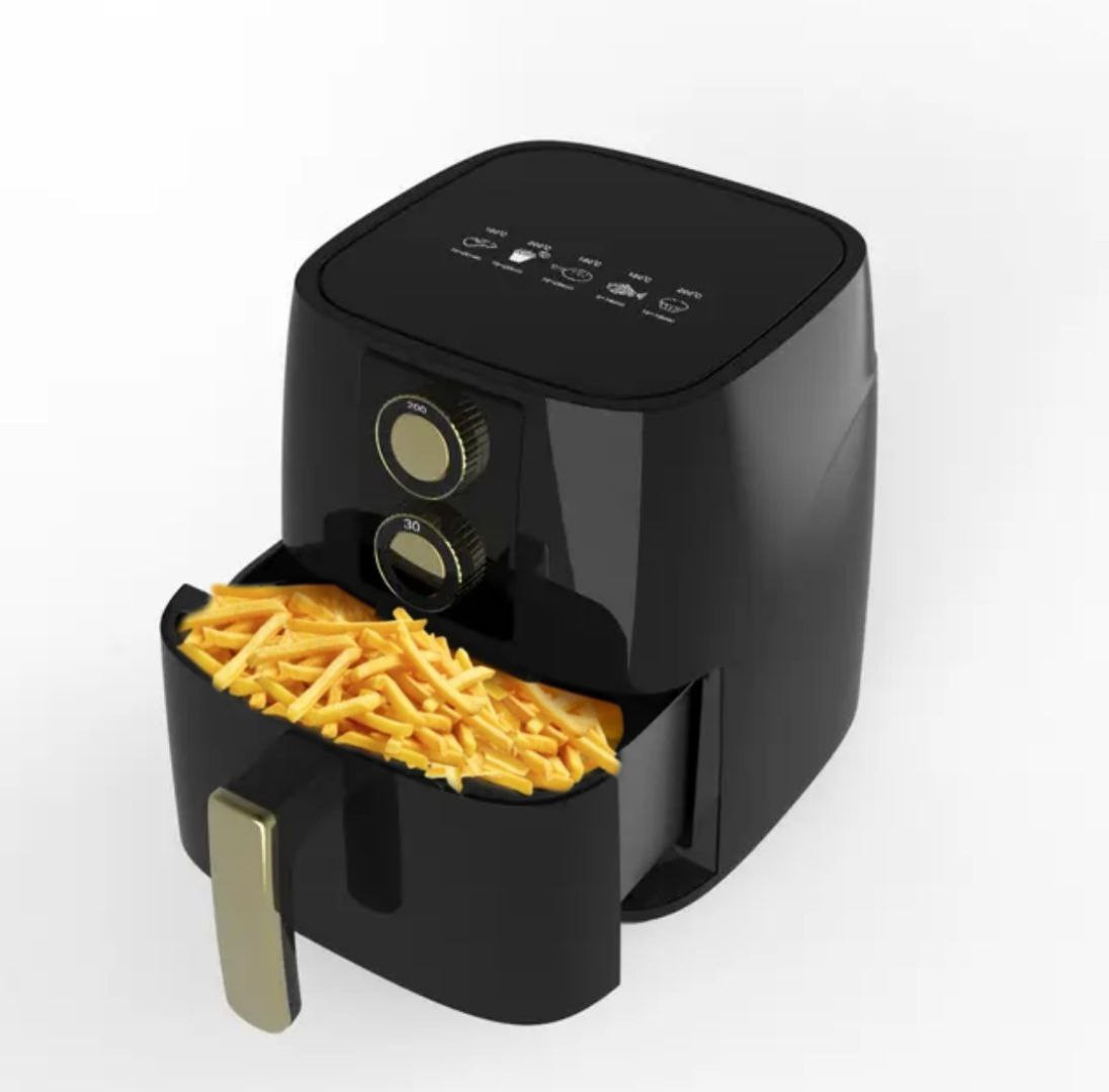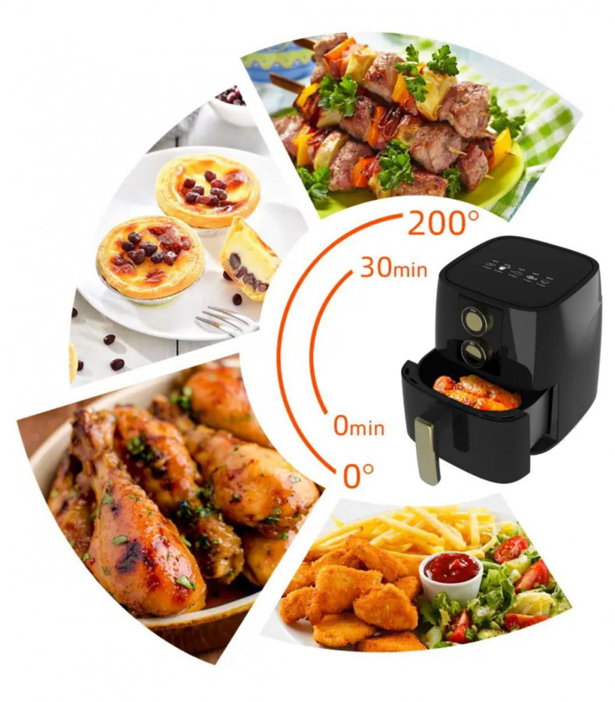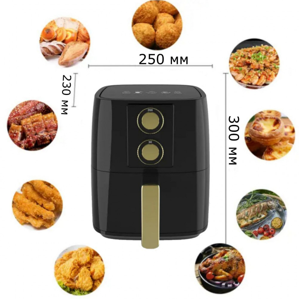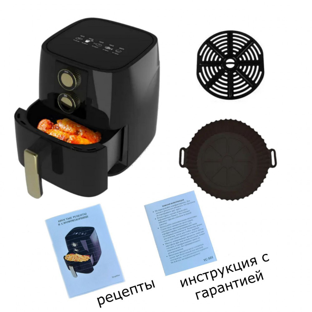 Аэрофритюрница – это кухонный прибор, который позволяет готовить разнообразные блюда без масла или с минимальным количеством масла. Принцип работы основан на циркуляции горячего воздуха, который обволакивает продукты со всех сторон, обеспечивая равномерное приготовление и хрустящую корочку. В комплекте идет решетка, форма для выпечки расширяющая возможности использования аэрофритюрницы.