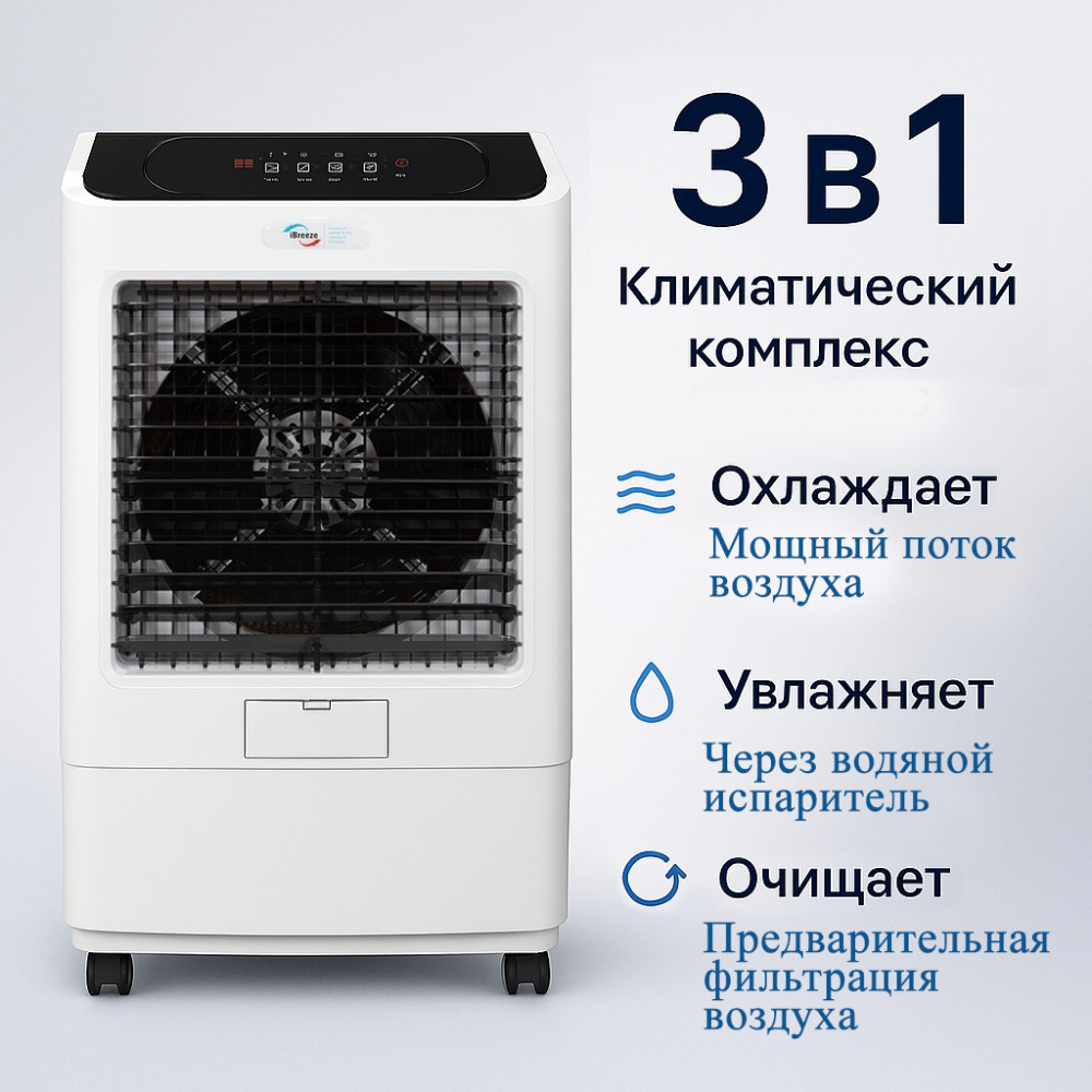 iBreeze Max 3-в-1 4500 м³/ч — климатический охладитель-вентилятор с ионизацией. Один прибор вместо трёх. Флагман для больших помещений: мощный поток 4500 м³/ч охлаждает до 90 м², увлажняет через водяной испаритель и предварительно очищает воздух. Тихая работа 56 дБ, сенсорное управление и пульт.