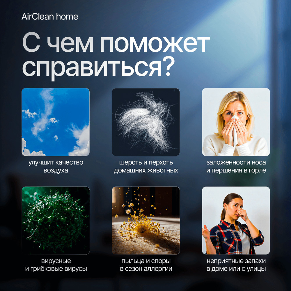 AirClean Home 50m убирает пыль, пыльцу, шерсть и перхоть животных, бытовые запахи после готовки, «городские» выхлопы, запахи после небольшого ремонта, снижает задымленность в проветриваемых условиях. Подходит для использования в спальне, детской, гостиной и кабинете, и других помещениях до 50 м².