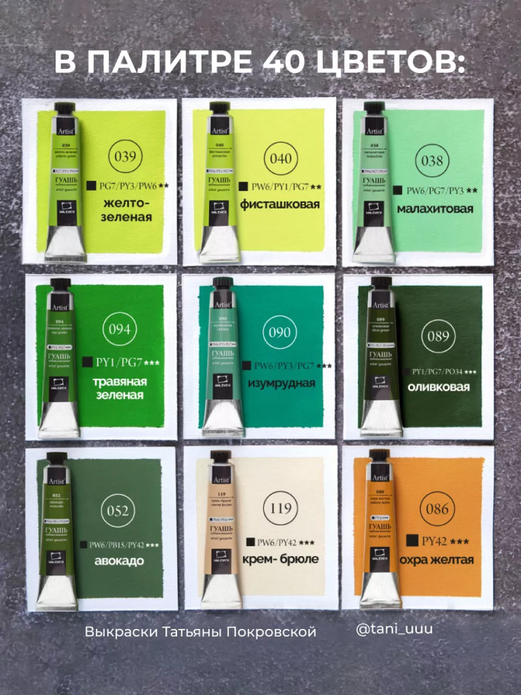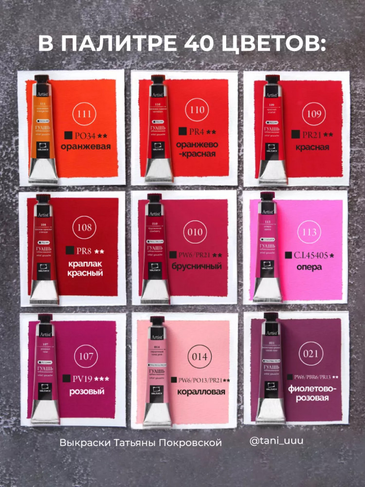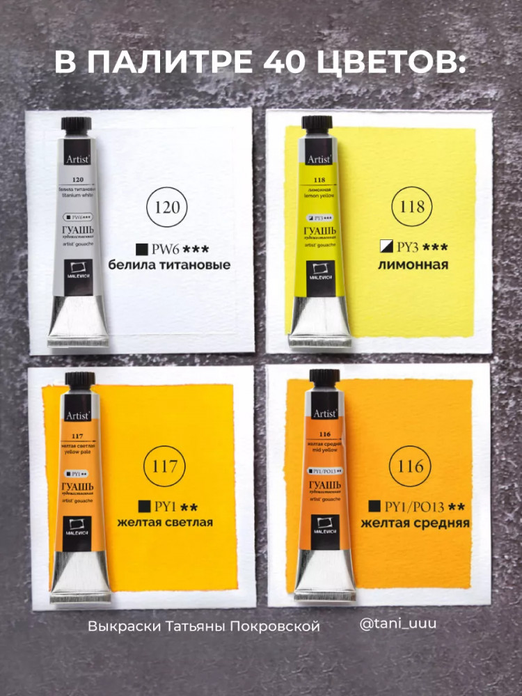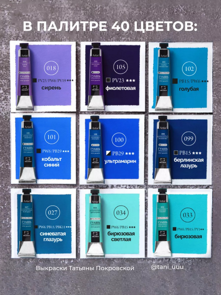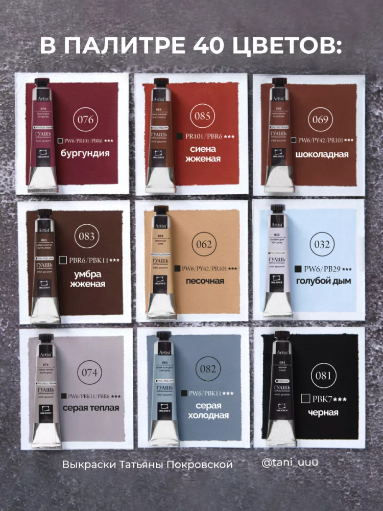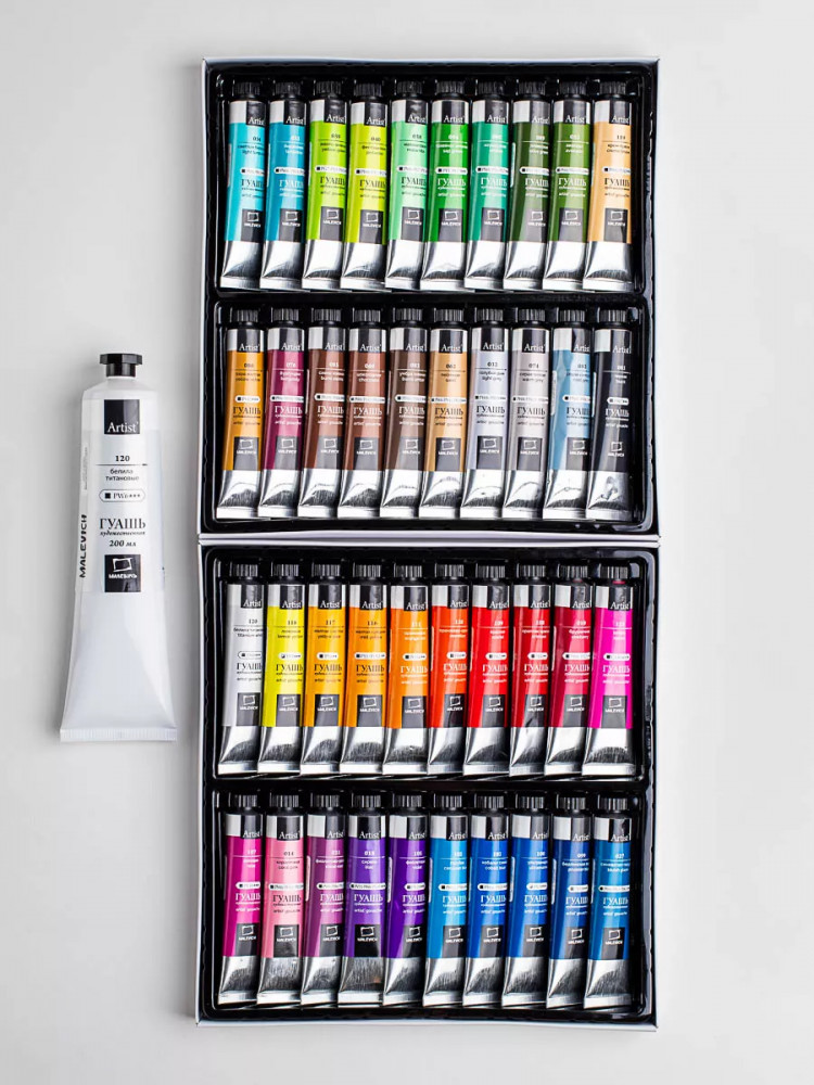 Гуашь — непрозрачный материал, поэтому ей можно рисовать не только на белой бумаге, но также краски эффектно выглядят на тонированной бумаге, например, серой. Но следует учитывать, что на тонированной бумаге краски немного меняют свою интенсивность цвета и выглядят мягко и сглаженно. Большой набор гуаши из 40 оттенков + белила титановые без проблем позволяет подобрать цветовую гамму для любой бумаги. Гуашь поштучно упакована в металлические тубы, что намного лучше, чем гуашь в банках, грязная кисть никогда не окажется в общей краске.