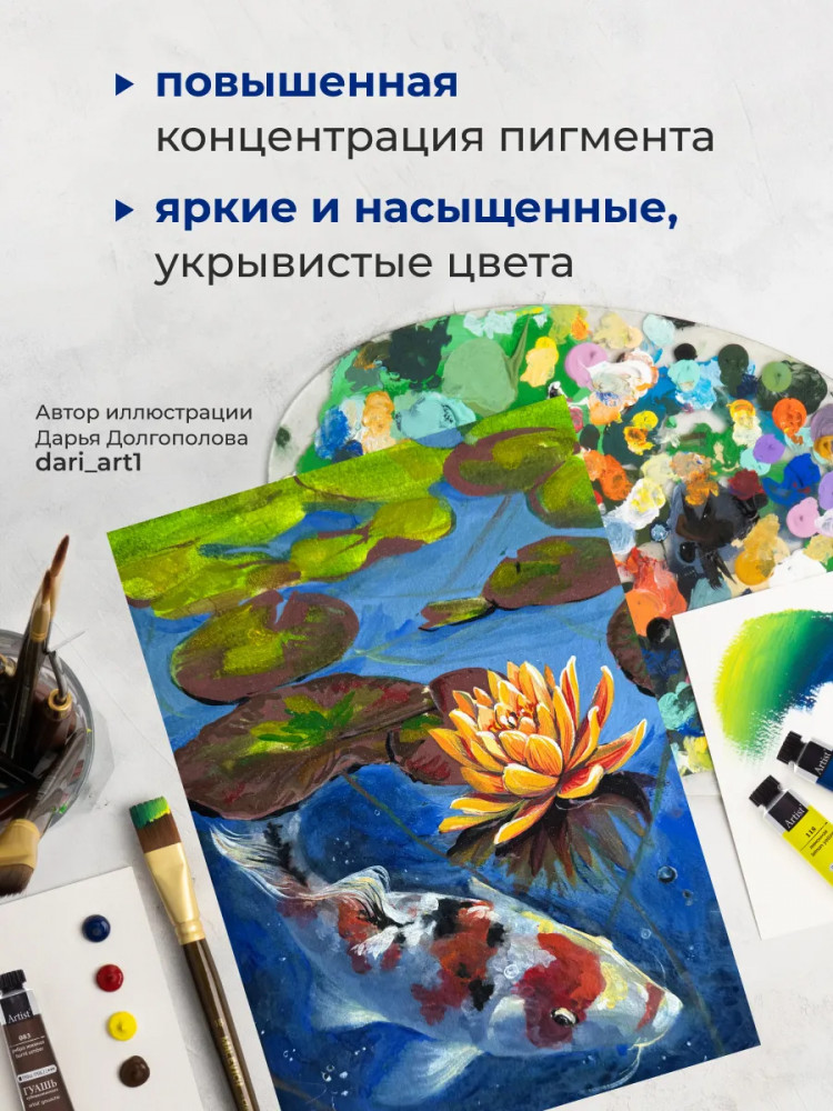 Гуашь художественная открывает множество возможностей для экспериментов. Традиционно это непрозрачные, плотные краски для рисования, которые после высыхания приобретают привлекательную бархатистую матовость, делающую краски гуашь особенными.
