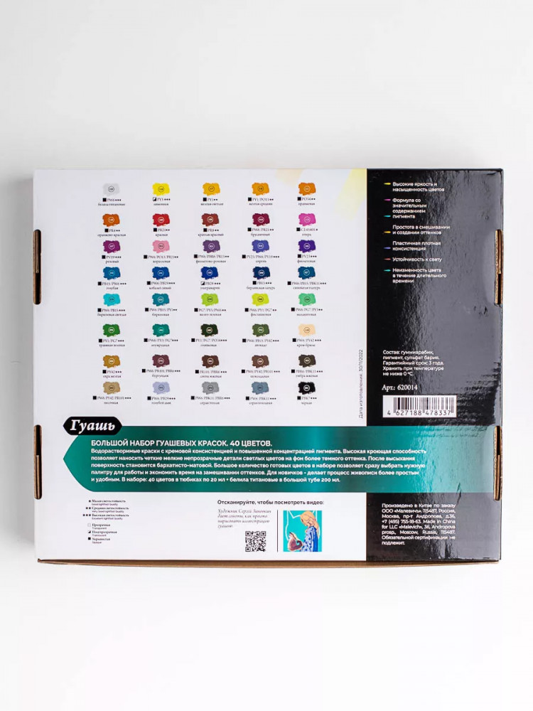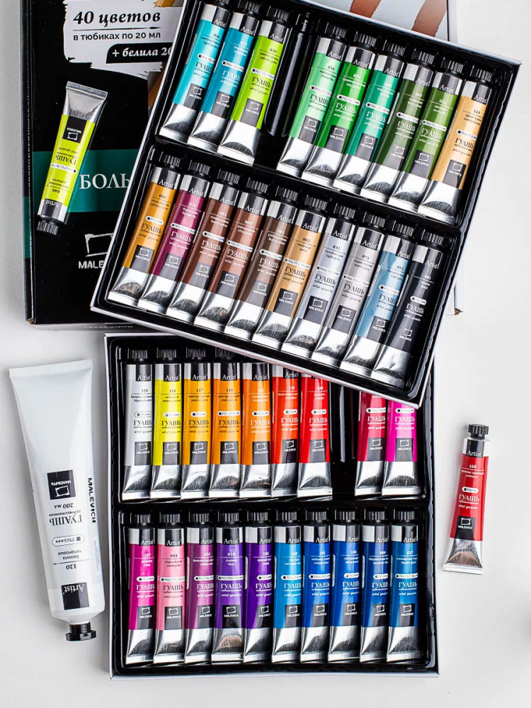 Большой набор гуашевых красок из 40 цветов в тюбиках по 20 мл + гуашь белая в большой тубе 200 мл.