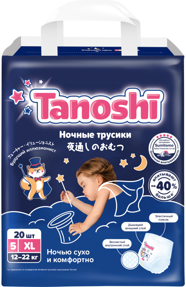 Детские ночные трусики-подгузники Tanoshi для малышей с весом 12-22 кг (XL, 5) — мягкие и нежные, как хлопковое бельё, одноразовые трусики впитывают на 40% больше влаги, по сравнению с трусиками того же размера базовой линейки Таноши. Усиленный впитывающий слой за счет добавления дополнительного количества абсорбента обеспечивает большее влагопоглощение и запирает жидкости внутри трусиков в течение длительного времени между сменой подгузников. Ночные трусики Tanoshi сохраняют кожу ребёнка сухой в течение всей ночи, даже если малыш активно ворочается во сне.