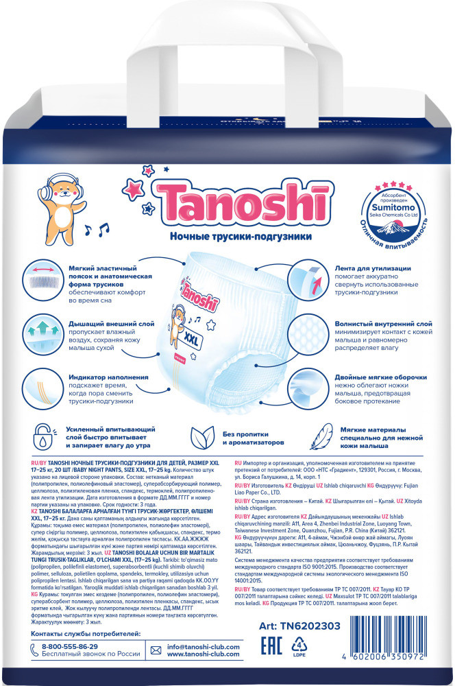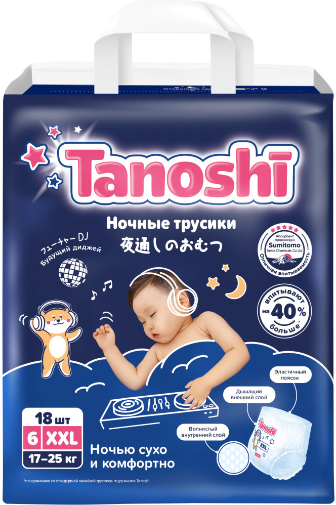 В ночных трусиках Таноши кожа малыша без присыпок и детского крема под подгузник надёжно защищена от опрелостей, раздражений и «парникового эффекта». Мягкий боковой шов, неощутимый для нежной кожи ребёнка, легко разрывается при замене трусиков. Лента утилизации позволяет аккуратно свернуть использованные трусики. А цветной индикатор наполнения подскажет, когда трусики пора сменить на новые. Ночные Таноши одинаково хорошо подходят для мальчиков и для девочек, гипоаллергенны, не содержат отдушек и пропитки. Tanoshi (с японского «восхитительный») созданы экспертами отрасли с многолетним опытом и сочетают в себе все самые лучшие разработки последних лет.