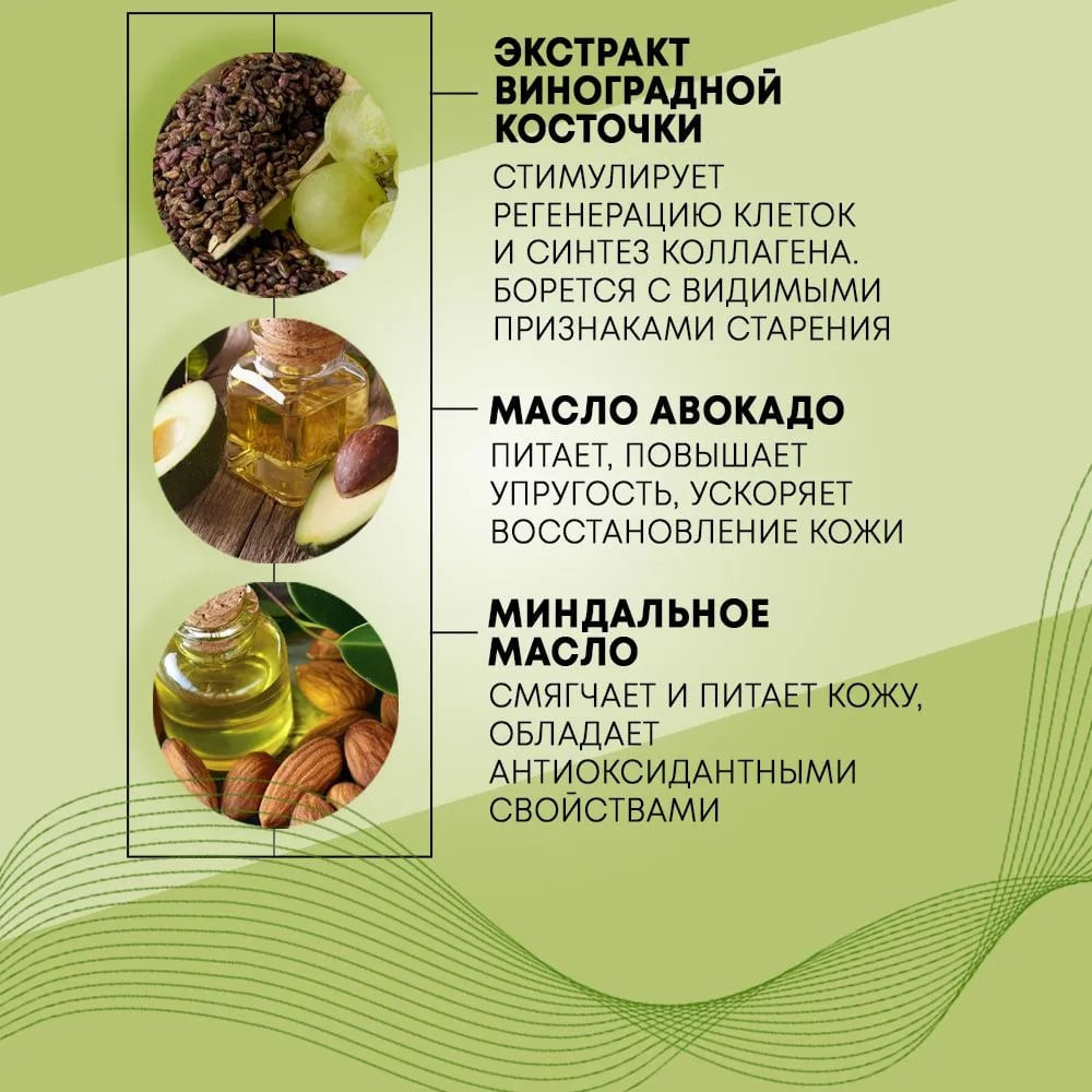 • экстракт виноградной косточки: стимулирует регенерацию клеток и синтез коллагена. Борется с видимыми признаками старения. Оказывает противовоспалительное действие. Повышает уровень увлажненности кожи, способствуя укреплению ее водно-липидной мантии, защитного барьера;