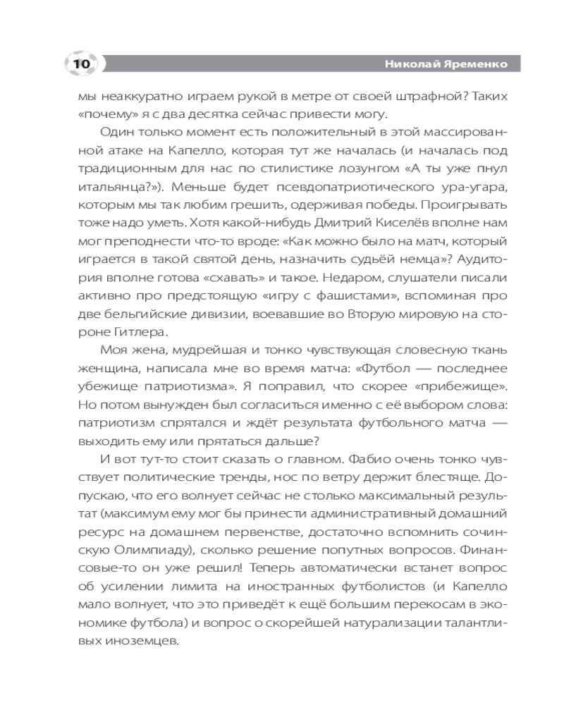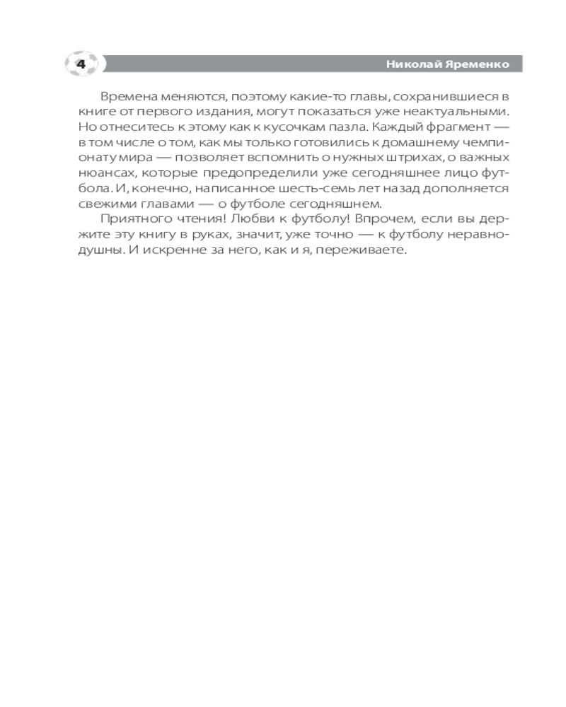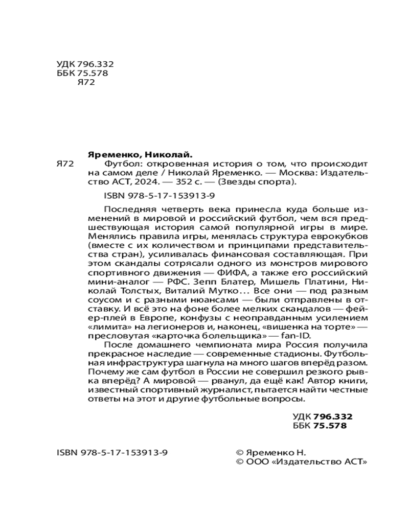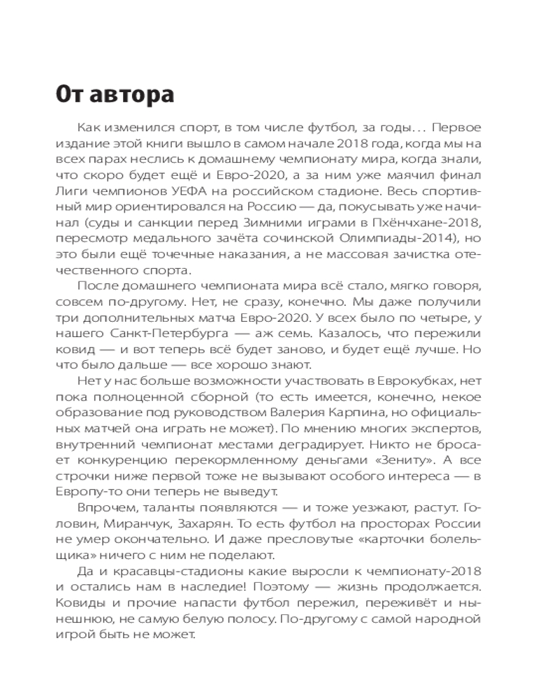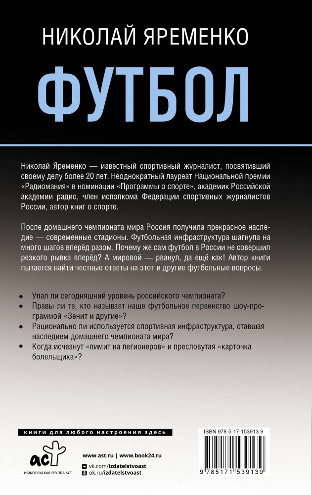 💳 Оплатить за товар можно при получении 🇰🇿 Есть бесплатная доставка по Казахстану от 1 дня 🎁 Копите бонусы с каждой покупки Серия: Звезды спорта Николай Яременко — известный спортивный журналист, посвятивший своему делу более 20 лет. Неоднократный лауреат Национальной Премии «Радиомания» в номинации «Программы о спорте», академик Российской академии радио, член исполкома Федерации спортивных журналистов России, автор книг о спорте. Последняя четверть века принесла куда больше изменений в мировой и российский футбол, чем вся предшествующая история самой популярной игры в мире. Менялись правила игры, менялась структура еврокубков (вместе с их количеством и принципами представительства стран), усиливалась финансовая составляющая. При этом скандалы сотрясали одного из монстров мирового спортивного движения — ФИФА, а также его российский мини-аналог — РФС. Зепп Блатер, Мишель Платини, Николай Толстых, Виталий Мутко... Все они — под разным соусом и с разными нюансами — были отправлены в отставку. И всё это на фоне более мелких скандалов — фейер-плей в Европе, конфузы с неоправданным усилением «лимита» на легионеров и, наконец, «вишенка на торте» — пресловутая «карточка болельщика» — fan-ID. После домашнего чемпионата мира Россия получила прекрасное наследие — современные стадионы. Футбольная инфраструктура шагнула на много шагов вперёд разом. Почему же сам футбол в России не совершил резкого рывка вперёд? А мировой — рванул, да ещё как! Автор книги пытается найти честные ответы на этот и другие футбольные вопросы. |