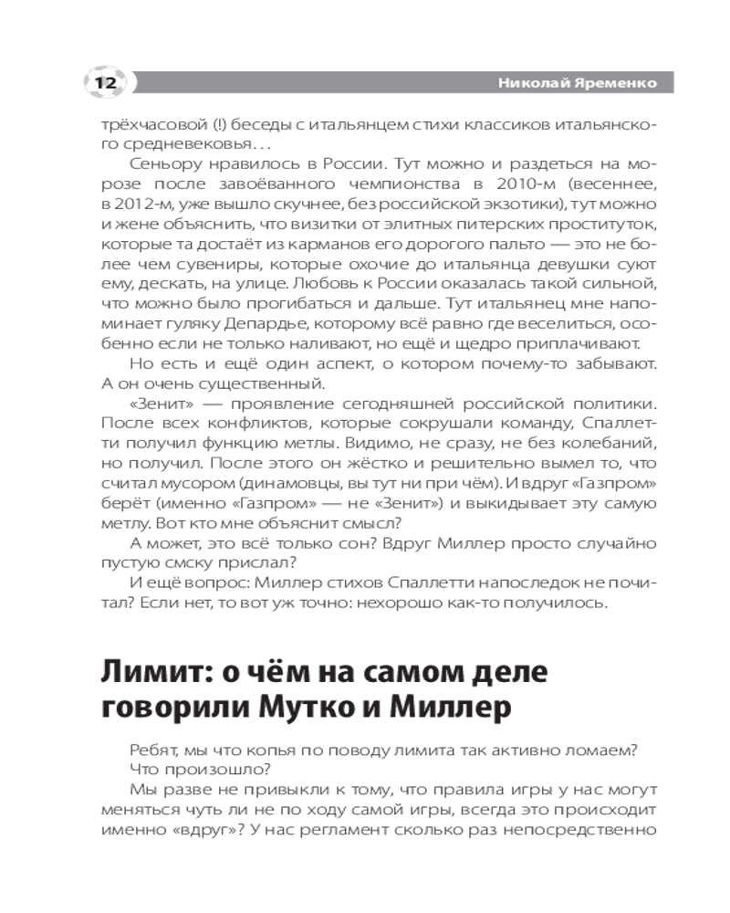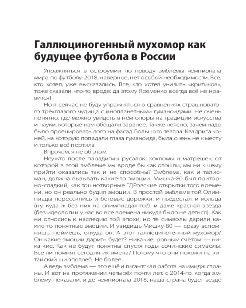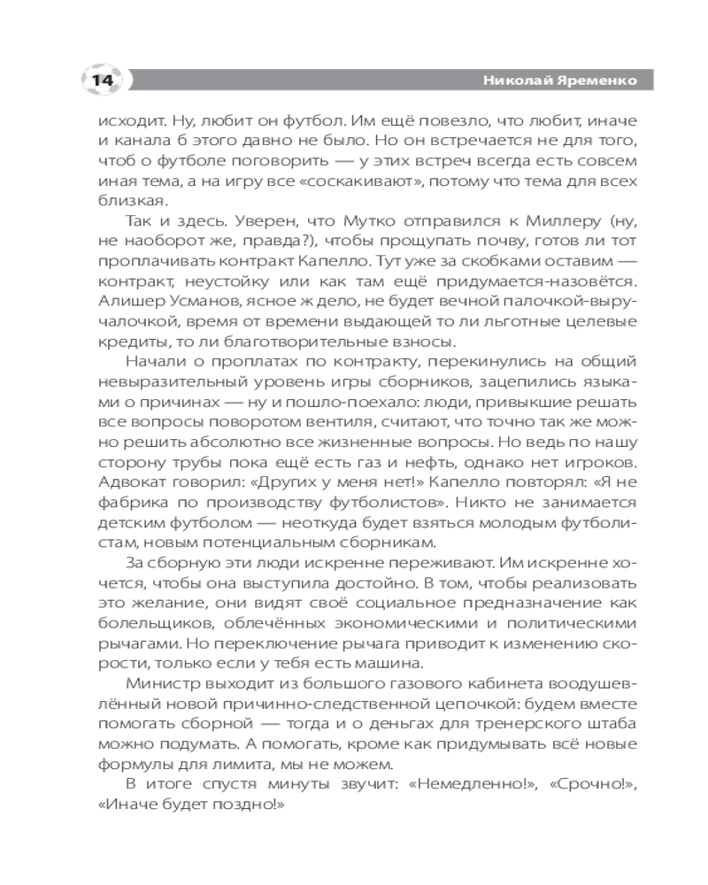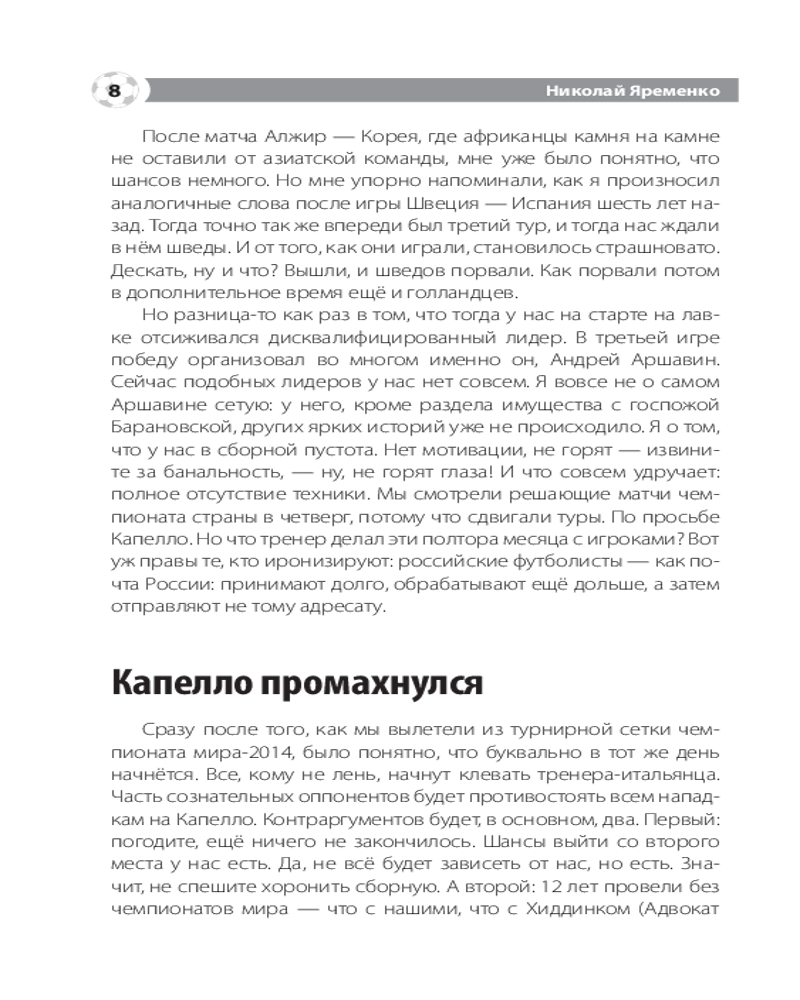 💳 Оплатить за товар можно при получении 🇰🇿 Есть бесплатная доставка по Казахстану от 1 дня 🎁 Копите бонусы с каждой покупки Серия: Звезды спорта Николай Яременко — известный спортивный журналист, посвятивший своему делу более 20 лет. Неоднократный лауреат Национальной Премии «Радиомания» в номинации «Программы о спорте», академик Российской академии радио, член исполкома Федерации спортивных журналистов России, автор книг о спорте. Последняя четверть века принесла куда больше изменений в мировой и российский футбол, чем вся предшествующая история самой популярной игры в мире. Менялись правила игры, менялась структура еврокубков (вместе с их количеством и принципами представительства стран), усиливалась финансовая составляющая. При этом скандалы сотрясали одного из монстров мирового спортивного движения — ФИФА, а также его российский мини-аналог — РФС. Зепп Блатер, Мишель Платини, Николай Толстых, Виталий Мутко... Все они — под разным соусом и с разными нюансами — были отправлены в отставку. И всё это на фоне более мелких скандалов — фейер-плей в Европе, конфузы с неоправданным усилением «лимита» на легионеров и, наконец, «вишенка на торте» — пресловутая «карточка болельщика» — fan-ID. После домашнего чемпионата мира Россия получила прекрасное наследие — современные стадионы. Футбольная инфраструктура шагнула на много шагов вперёд разом. Почему же сам футбол в России не совершил резкого рывка вперёд? А мировой — рванул, да ещё как! Автор книги пытается найти честные ответы на этот и другие футбольные вопросы. |
