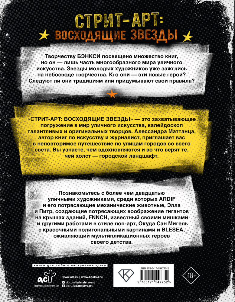 💳 Оплатить за товар можно при получении 🇰🇿 Есть бесплатная доставка по Казахстану от 1 дня 🎁 Копите бонусы с каждой покупки Серия: Стрит-арт Творчеству Бэнкси посвящено множество книг, но он — лишь часть многообразного мира уличного искусства. Звезды молодых художников уже зажглись на небосводе творчества. Кто они — эти новые герои? Следуют ли они традициям или придумывают свои правила? «Восходящие звезды стрит-арта» — это захватывающее погружение в мир уличного искусства, калейдоскоп талантливых и оригинальных творцов. Алессандра Маттанца, автор книг по искусству и журналист, приглашает вас в неповторимое путешествие по улицам городов со всего света. Вы узнаете, чем вдохновляются и во что верят те, чей холст — городской ландшафт. |