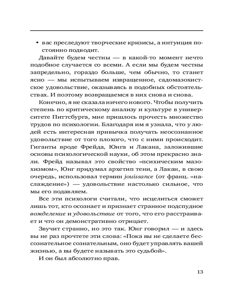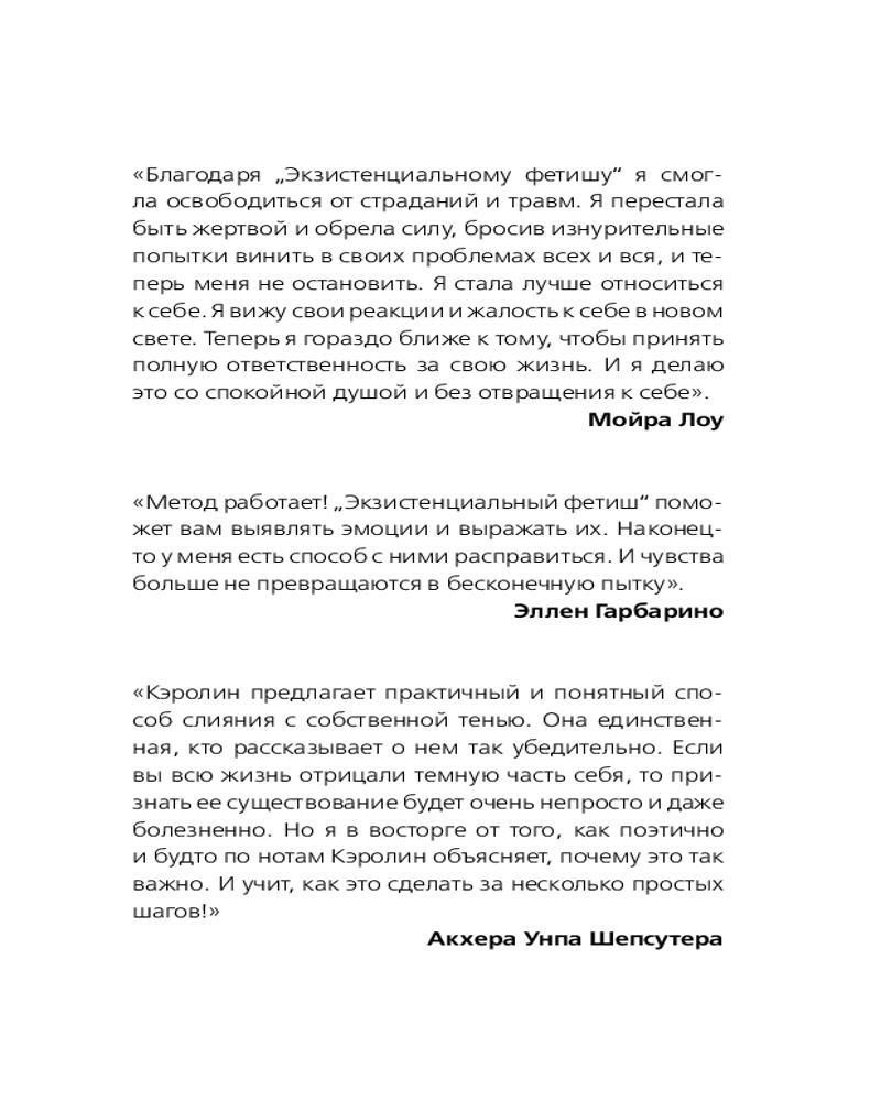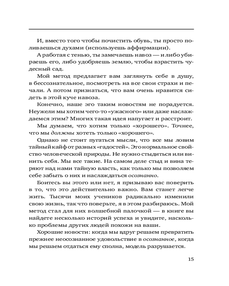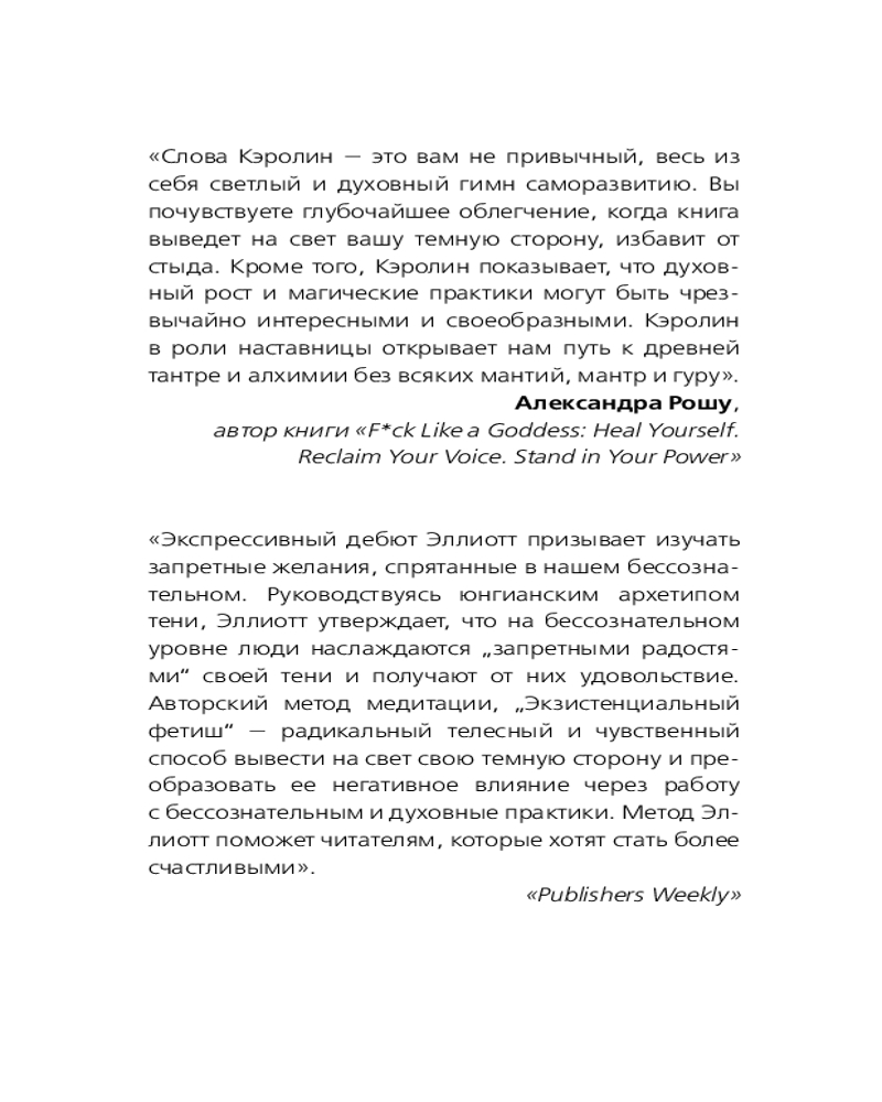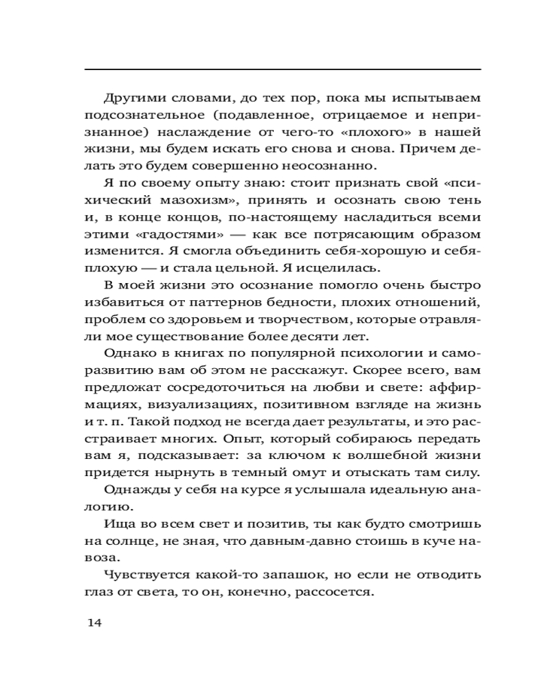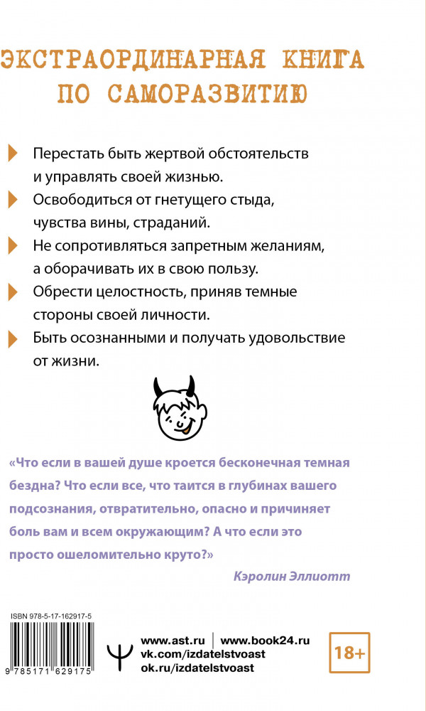 Сила темной стороны. Как превратить запретные желания подсознания в источник внутренней СилыВ данный момент этот товар отсутствует в продаже. Возможно, у нас найдется аналогичный или похожий товар здесь. Серия: Нескучная психология Современные книги учат мыслить позитивно и жить на «светлой стороне». Почему же это не всегда помогает? Почему мы испытываем лишения, боль, страх и стыд? Каждый из нас обладает двойственной натурой: в нас есть и свет, и тень. Мы привыкли считать темную сторону личности примитивной, животной. Мы подавляем и скрываем ее, полагая, что эти несовершенства — причина наших проблем. Умная, откровенная, провокационная книга Кэролин Эллиотт доказывает, что Тень хранит в себе источник нашей величайшей силы. |