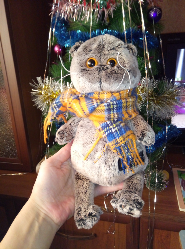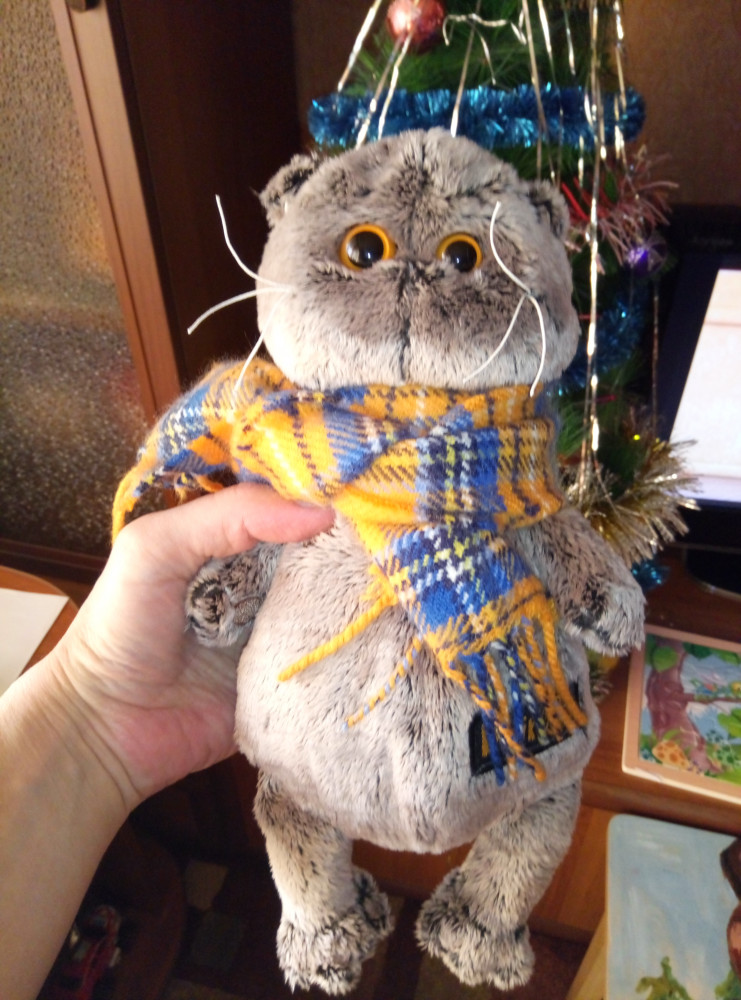 Кот как живой! Проработаны все детали, все очень аккуратно прошито, нигде не торчат нитки. Глазки блестящие как живые. Отличный мягкий мех, оочень приятный на ощупь, не вылезает. Шарф отдельный - снимается. Для утяжеления "в районе хвоста" проложены силиконовые шарики, что делает игрушку еще и антистрессовой) Взяла себе, но так и не увидела игрушку)) сын забрал ее в первый же момент и не выпускает из рук, теперь он у нас без "кисы" не засыпает))