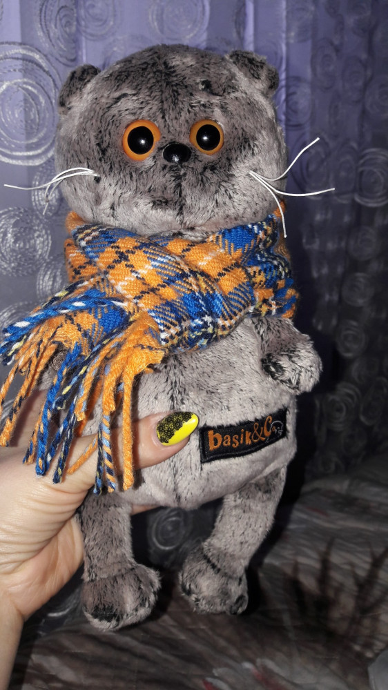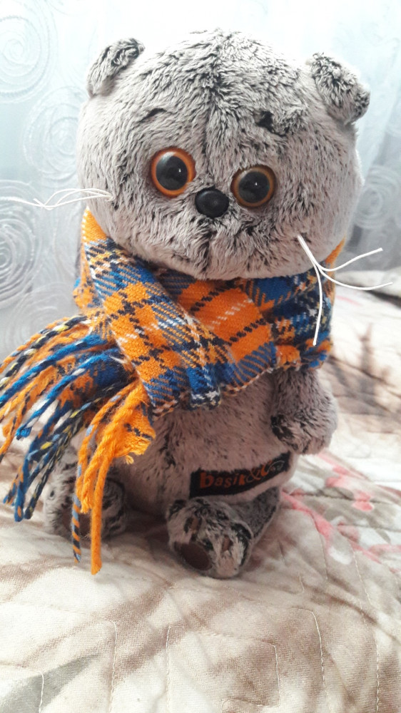 Пришел на слейдущий день после оформления покупки, коробка не помята и в отличном состоянии. Сзади есть анкета котика. А также замечательный бант цвета шоколада. Сам кот очень мягкий и приятный на ощупь. Глазки у него и вправду медовые и очень выразительные. Снизу у него имеются антистресовые шарики, что очень здорово. Шарфик великолепный. Такого даже людям не делают: мягкий и качественный. Шерсть короткая и гладкая. Сам по себе он прикольный и по дополнительной информации в интернете я узнала, что это кот путешественник. Он запаковывает себя в коробку и отправляется в путь. Теперь даже понятно почему в коробке есть дырочки. По версии производителей кот Басик утверждает, что так ездить по миру намного экономнее и интересней. Это очень забавно. Берите, не пожалеете.